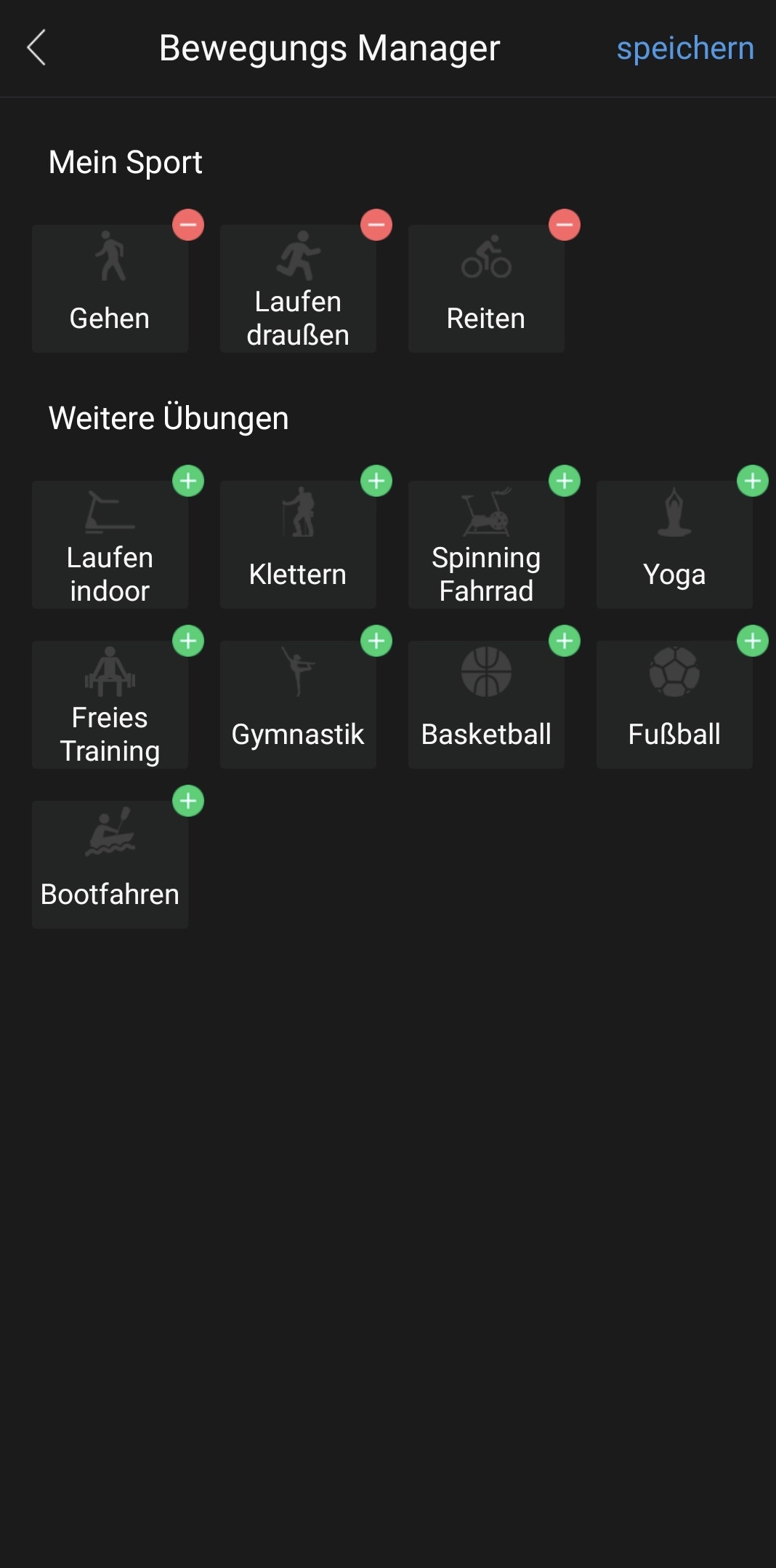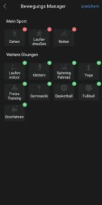 Unter „Sportarten“ kann man die Aktivität starten. Die bevorzugten Sportarten der 12 Modi kann man sich durch das „+“ in der oberen rechten Ecke in den oberen Bereich des Bildschirms legen.