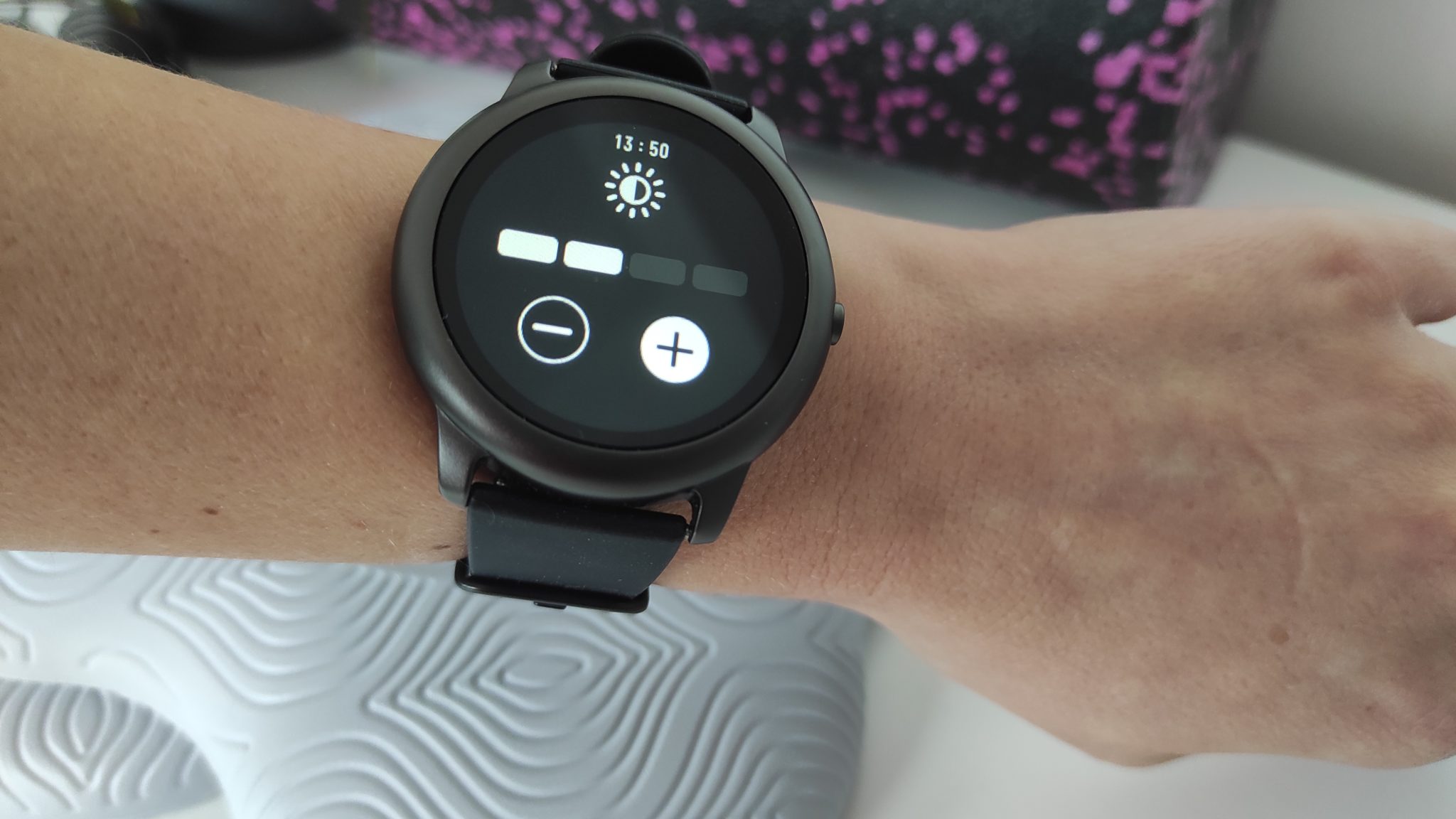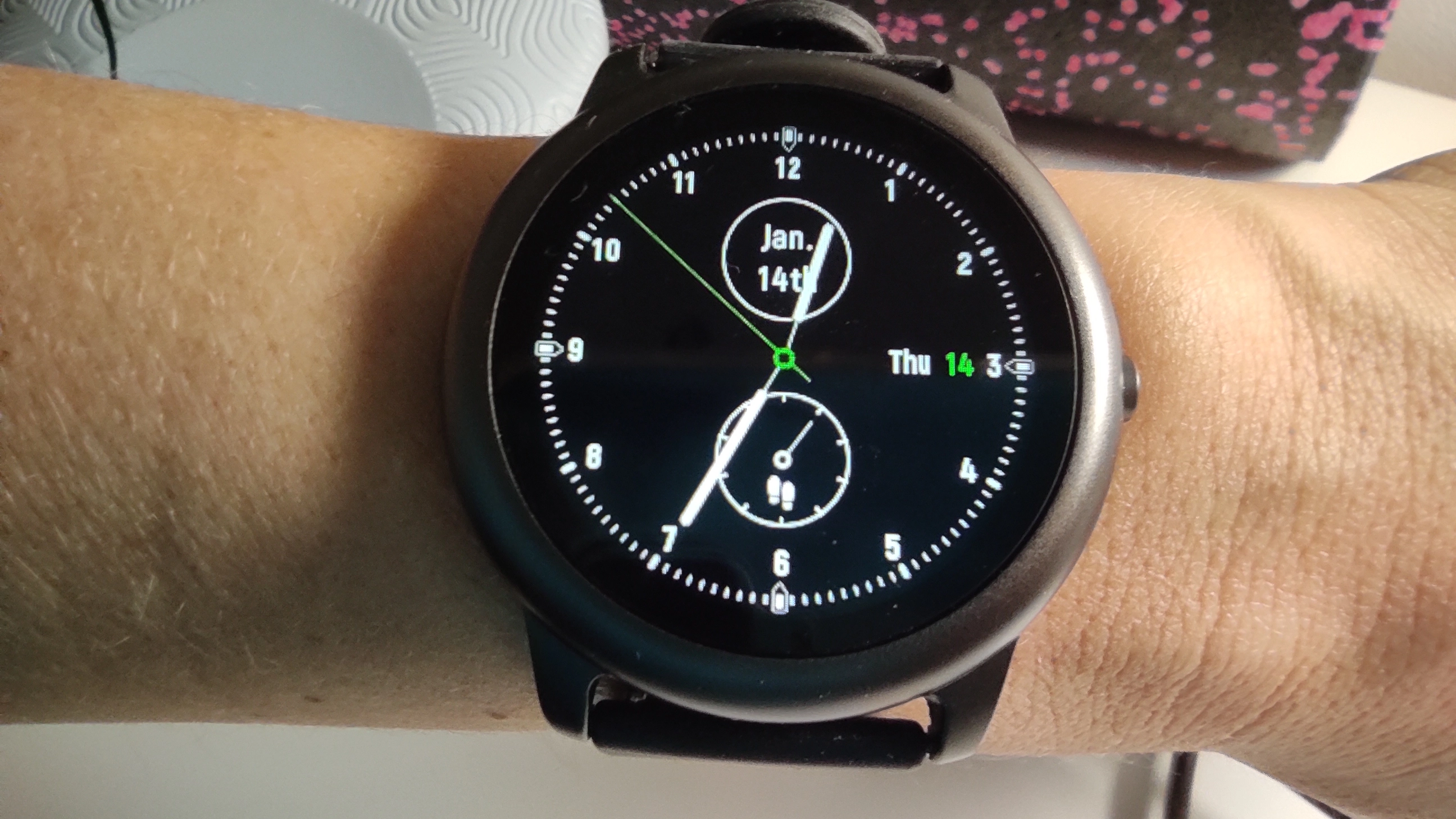 Einschalten lässt sich das Display entweder über die Funktionstaste am rechten Gehäuserand oder – wie ich es während der Testphase über die App eingestellt hatte – per Handbewegung. Hier war die Reaktionszeit ca. 1 bis maximal 2 Sekunden, was ich in Ordnung finde. Das Anschalten per Handdrehung hat bei mir die meiste Zeit auch funktioniert, was ich angesichts meines sehr schmalen Handgelenks nicht gedacht hätte. Man muss sich allerdings auch im Klaren darüber sein, dass ein gewisser Bewegungsumfang erforderlich ist. So reicht es z.B. nicht, wenn man das Handgelenk nur ein paar Zentimeter bewegt, sondern es bedarf schon einer viertel Armumdrehung.