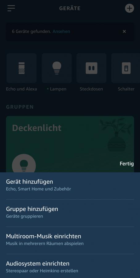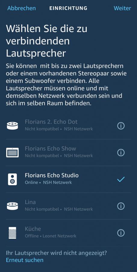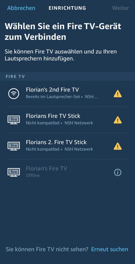 Um das Heimkino einzurichten, müsst ihr in der Alexa App auf den Tab „Geräte“ gehen. Dort klickt ihr dann auf das Plus-Zeichen in der oberen rechten Ecke. Im dann erscheinenden Auswahlmenü wählt ihr „Audiosystem einrichten“ aus und im nächsten Schritt den Punkt „Heimkino“. Jetzt müsst ihr zuerst euer kompatibles Fire TV Gerät auswählen. Wenn ein Fire TV Stick nicht kompatibel ist, erkennt ihr das an dem gelben Dreieck mit Ausrufezeichen. Habt ihr die Auswahl getroffen, könnt ihr im danach den Echo-Lautsprecher hinzufügen. In meinem Fall steht hier nur der Echo Studio zur Verfügung, es gibt aber bereits Meldungen von Nutzern, die auch weitere Echo Geräte auswählen konnten. Zum Schluss müsst ihr noch einen Namen für die Gruppe vergeben und sie einem Bereich hinzufügen.