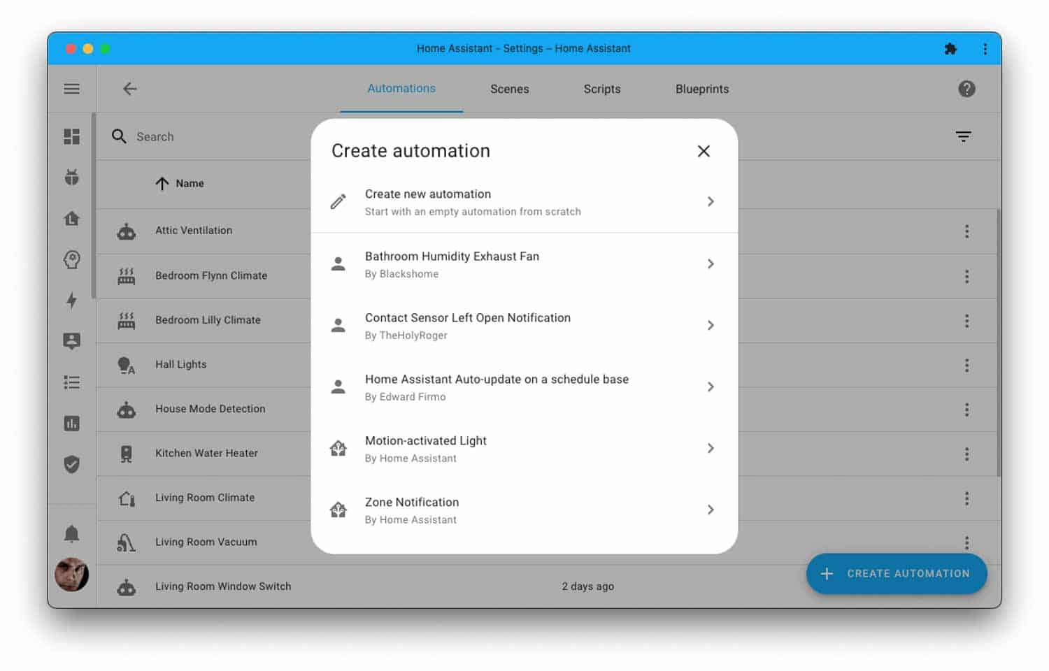 Beim Dialog zum Erstellen von Automatisierungen ist ebenfalls was passiert. Zum einen wurde der Look angepasst und zum anderen kann man jetzt schnell ein Blueprint für die Automatisierung direkt auswählen oder neu erstellen.
