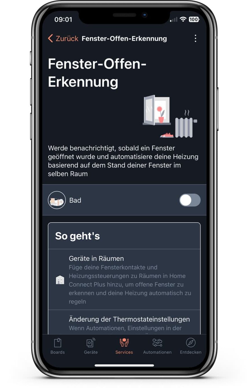 Jetzt ist auch wieder eine neue Funktion herausgekommen, die ihr bei euren Thermostaten sicherlich schon kennt. Die Fenster-Offen-Erkennung misst nun den rapiden Abfall der Temperatur, wenn Fenster geöffnet werden. So werden also diverse Geräte runtergefahren, die bei solchen Szenarien viel Energie schlucken würden. Thermostate, die diese Erkennung nicht automatisch mit an Bord hatten, können durch die Home Connect Plus App diese jetzt zusätzlich bekommen.