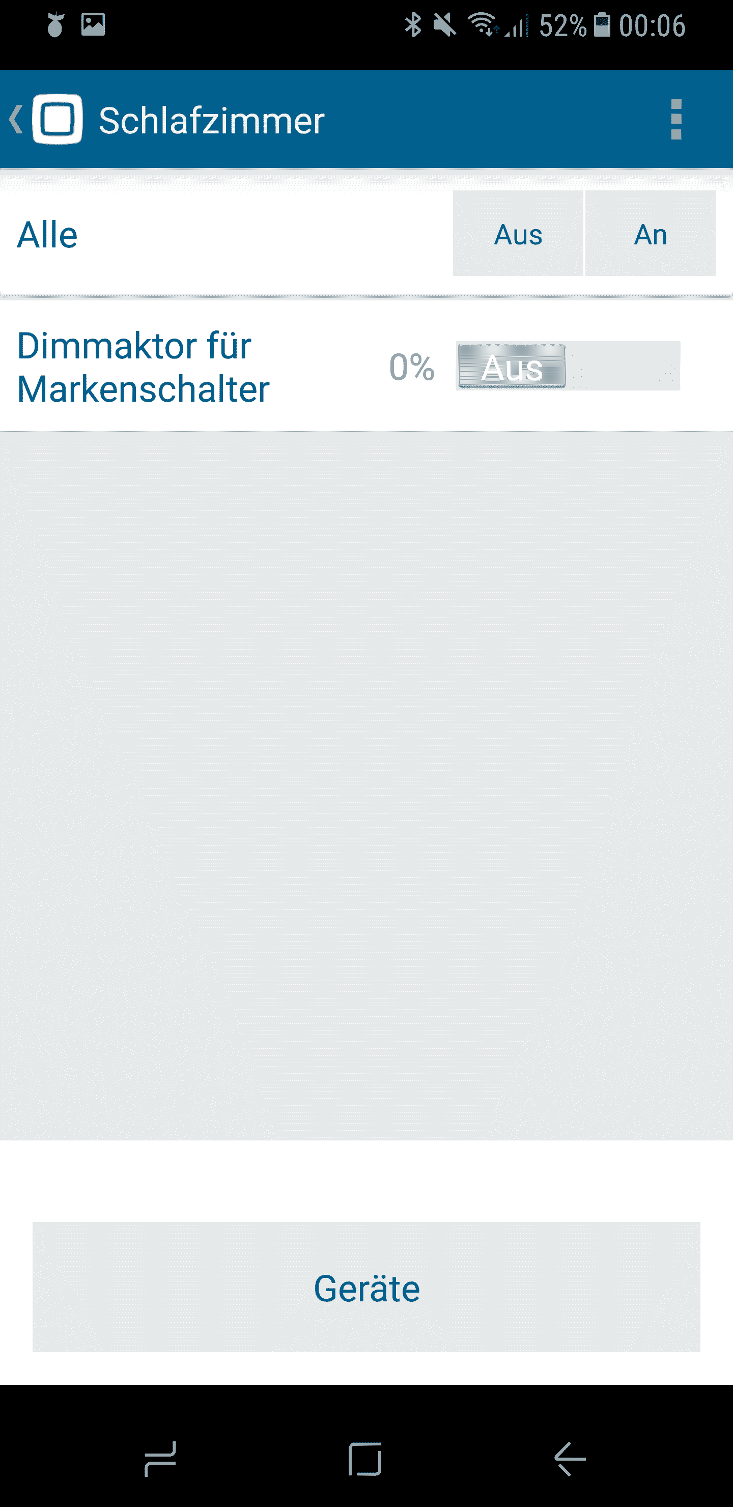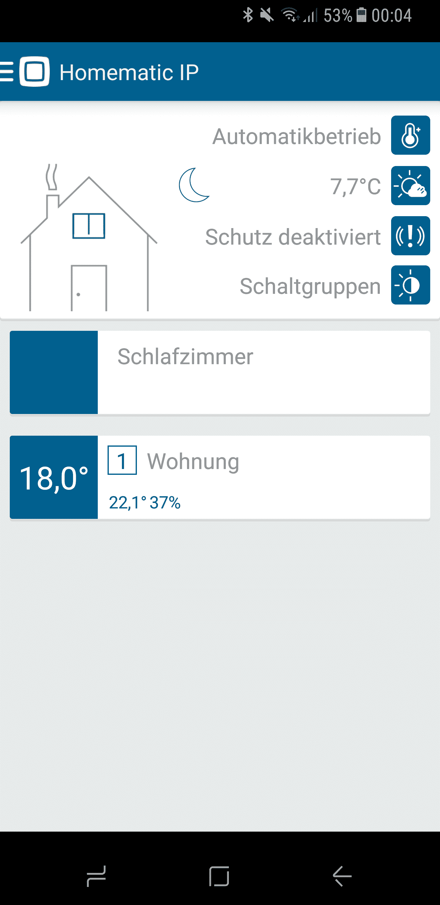 - Dies ist der Homescreen. Dort seht ihr das neu eingerichtete Zimmer (Schlafzimmer) in dem der Homematic IP Dimmaktor hinzugefügt wurde. Wenn ihr auf das Schlafzimmer tippt, gelangt ihr zum dritten Screenshot.