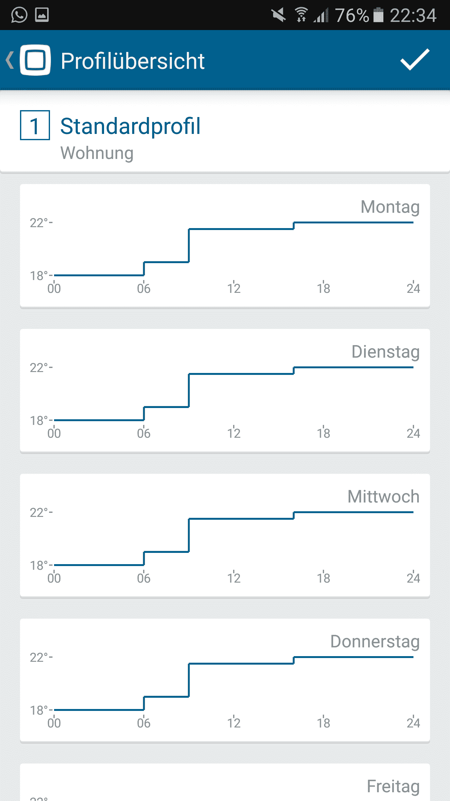 - Auf dem Screenshot „Homematic IP Heizprofil“ seht ihr nun noch, wie man sich sein persönliches Heizprofil anlegen kann. Da ich entweder zuhause oder ein paar Tage am Stück abwesend bin, sieht mein Profil so aus, wie ihr es dort erkennen könnt. Mein Fokus liegt darauf, dass es Abends wärmer wird. Außerdem möchte ich nicht, dass meine Wohnung nachts zu sehr auskühlt und habe deswegen die Minimaltemperatur auf 18 Grad gesetzt. Diese Werte haben sich bei mir aber auch erst nach ein paar Wochen ergeben, da man sich da rantasten muss, um die richtigen Werte für sein Homematic IP Heizkörperthermostat herauszufinden.