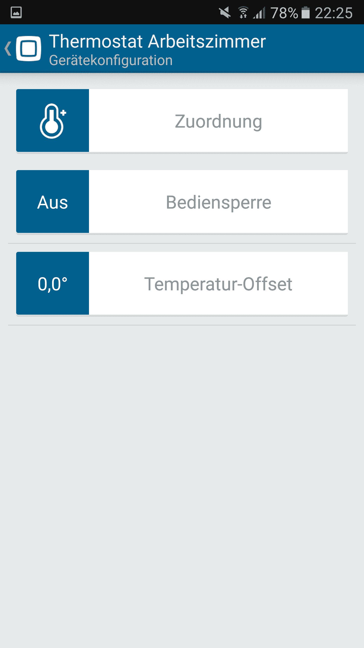 - Auf dem nächsten Screenshot seht ihr die Einstellungen, die ihr für jedes einzelne Homematic IP Heizkörperthermostat vornehmen könnt. Die „Zuordnung“ steht dafür, welchem Raum ihr es zuordnen möchtet. Die „Bediensperre“ bedeutet, dass ihr am Thermostat die Knöpfe nicht mehr bedienen könnt und eine Art Tastensperre eingerichtet habt. Das „Temperatur-Offset“ steht dafür, das ihr die Basistemperatur um einen bestimmten Wert anheben oder senken könnt.