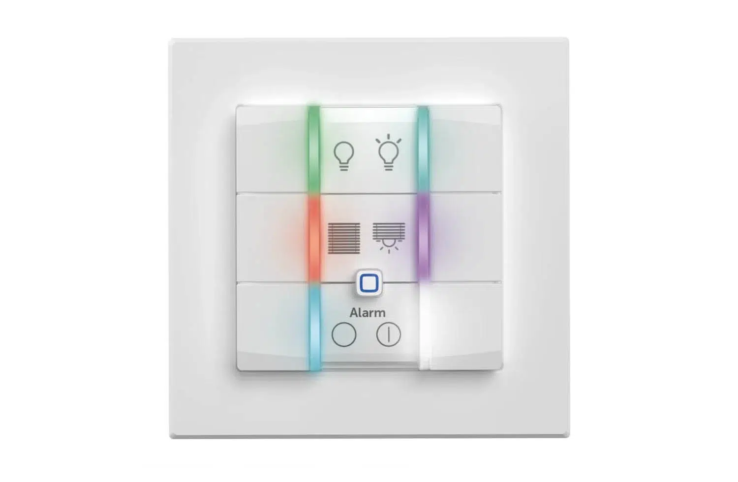 Jede Taste ist mit einer mehrfarbigen Status-LED ausgestattet, die Zustände wie aktivierte Modi oder eingeschaltete Verbraucher visuell signalisiert. Das sorgt für mehr Übersicht und Transparenz im Smarthome.
