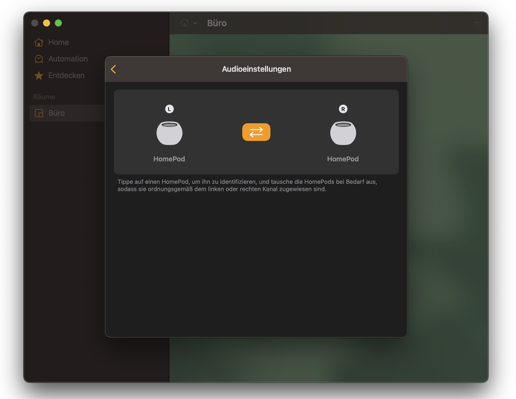 Sind die beiden HomePods dann miteinander verbunden, werden sie in der Home App als Stereopaar eingezeigt. In den Optionen der HomePods habt ihr dann auch weitere Einstellungsmöglichkeiten, wie zum Beispiel das Vertauschen von Links und Rechts.
