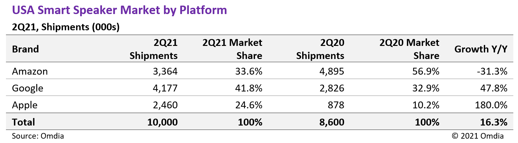 Der HomePod mini ist verhältnismäßig sehr günstig und bietet sehr gute Funktionen. Deshalb ist der HomePod mini auch so beliebt und verkauft sich unglaublich gut! Mit einem Apple TV 4K könnt ihr mit 2 HomePod minis sogar eine Soundbar ersetzen. Laut den neusten Statistiken konnte Apple in den USA einen höheren Marktanteil bei den Smart Speakern verbuchen. Auch ich bin mit dem HomePod mini sehr zufrieden. Wie wir wissen kam der große Bruder gar nicht gut an und war teilweise viel zu teuer. Apple hat sogar die Produktion des großen HomePod gestoppt. Während der HomePod nur einen Marktanteil von 10,2 % hatte, ist der des HomePod mini mit 24,6 % deutlich höher. Die Marktbeobachter Plattform Omdia hat dies sehr gut zusammengefasst.