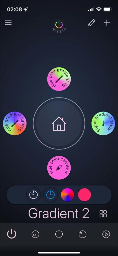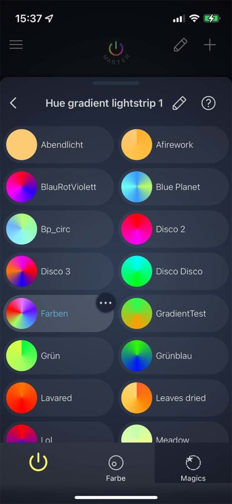 Wir freuen uns, Dir volle Unterstützung für Gradientenleuchten anzukündigen – und zwar JEDE dieser Art! Du kannst jetzt Magische Szenen mit nur einem einzigen Tipp auf diesen Leuchten aktivieren, ebenfalls erhältst Du Gradienten bei in Gruppen aktivierten Magischen Szenen (dies kannst Du ggf. in den Einstellungen abschalten). Zusätzlich kannst Du jetzt Szenen mit Gradienten erzeugen und überall in der App nutzen – beispielsweise für Timer, Schalter, Kommen-/Gehen-Aktionen. Drag & Drop funktioniert zwischen Gradientenleuchten ebenso. Der Pro-Lichtmigrationswizard, der Dir die Arbeit beim Tausch von Lampen abnimmt, unterstützt sie. Ebenso funktionieren sie im Widget und für Siri Shortcuts.
