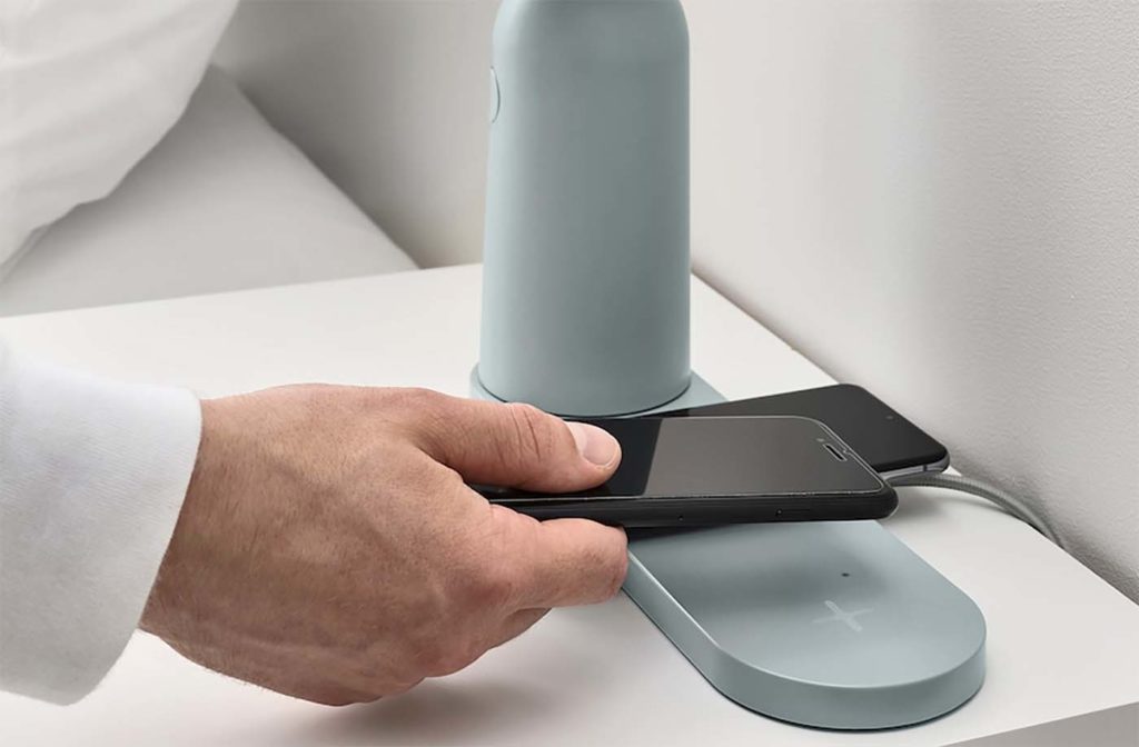 Der Lampenfuß ist gleichzeitig ein großes Qi-Ladepad, auf welchem die Leuchte kabellos aufgeladen werden kann. Gleichzeitig bietet es Platz für zwei weitere Geräte, sodass man zum Beispiel zwei Smartphones zum Laden darauflegen kann.