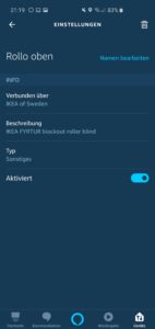 Wie auch alle anderen Smarthome Geräte aus dem Ikea Tradfri System, werden nun auch die Fyrtur Rollos in der Alexa App gefunden. Sobald sie mit dem Tradfri Gateway gekoppelt sind, werden sie so wie sie in der Tradfri App benannt wurden, in der Alexa App angezeigt.