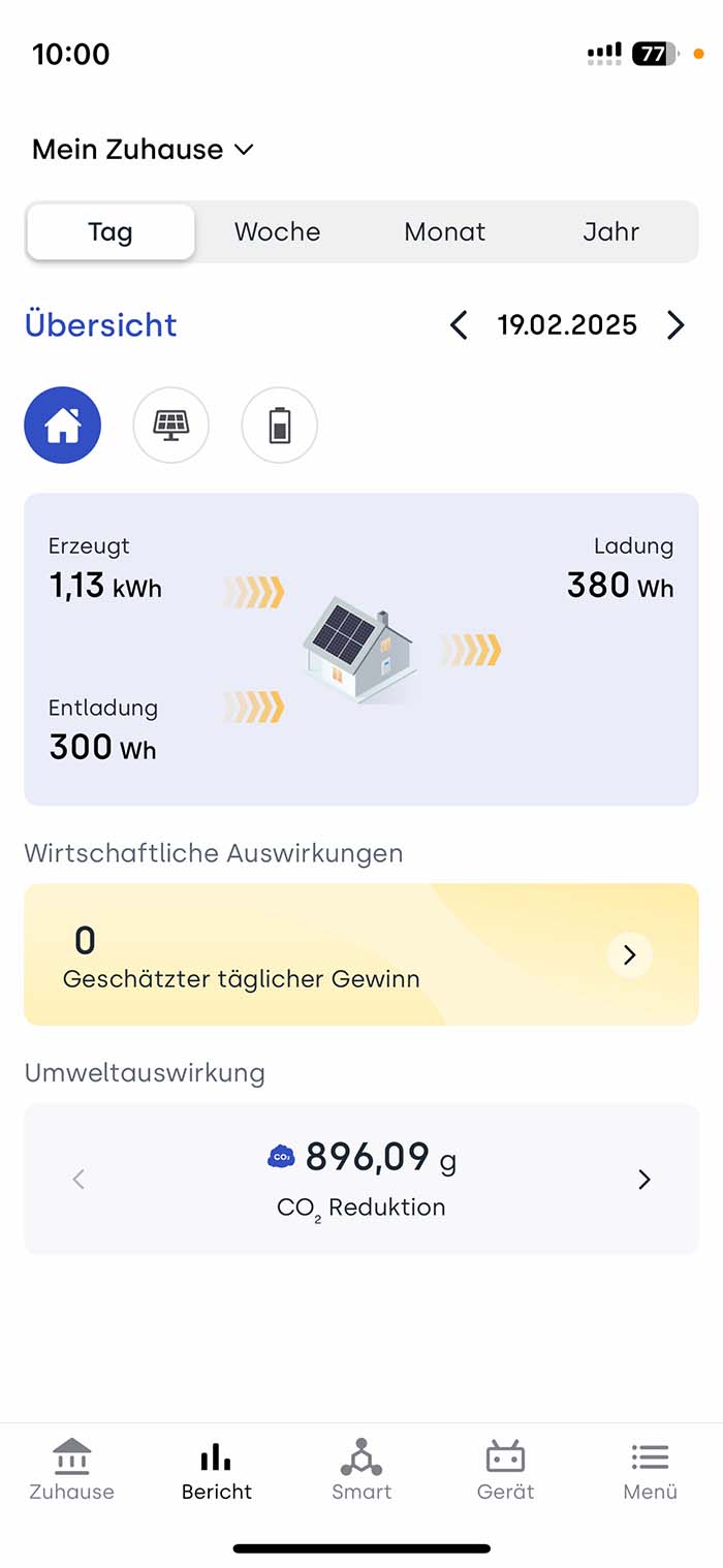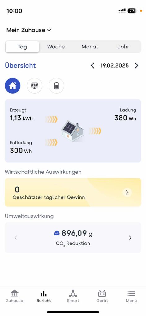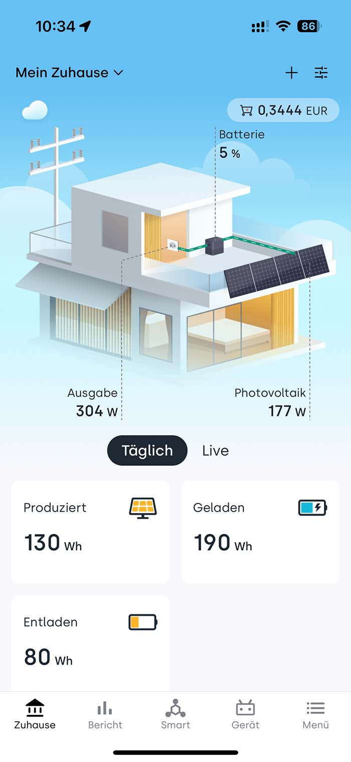 Ist das BK1600 hinzugefügt, kann die hauseigene Stromproduktion auch schon beginnen. In der App hat man eine Übersicht darüber, wie viel Strom aktuell produziert wird, was das Zuhause gerade verbraucht und welchen Ladestand der integrierte Speicher hat.