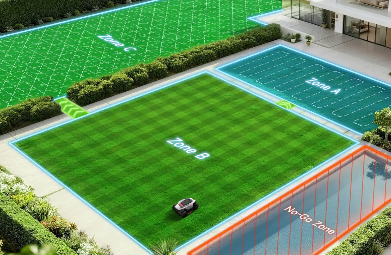 Auch klassische Mähroboter können mehrere Flächen schaffen, solange diese irgendwie miteinander verbunden sind. Meist läuft das über schmale Übergänge, die beim Verlegen des Begrenzungsdrahts/Kabels eingeplant werden. In der Praxis kommt es dabei stark auf die Ausführung an. Sind solche Verbindungen zu eng, zu verwinkelt oder ungünstig angelegt, nutzt der Roboter sie nur selten. Dann wird eine Fläche regelmäßig gemäht, während ein anderer Bereich sichtbar zu kurz kommt. Einige Geräte bieten dafür mehrere Startpunkte. Der Roboter startet dann nicht immer nur von der Ladestation aus, sondern wird an verschiedenen Punkten ins Mähgebiet geschickt. Das kann helfen, mehrere Bereiche besser abzudecken. Es ersetzt aber keine echte Zonensteuerung.
