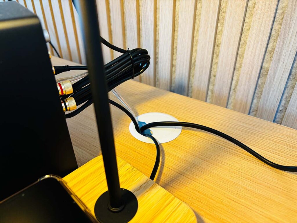Praktisch: Das Bedienfeld besitzt einen USB-A Anschluss, an welchem zum Beispiel eine Powerbank oder ein Smartphone schnell und einfach aufgeladen werden können. Die Tischplatte besitzt außerdem einen Kabelschacht, damit Kabel vom Monitor oder anderen Geräten ordentlich verlegt werden können.
