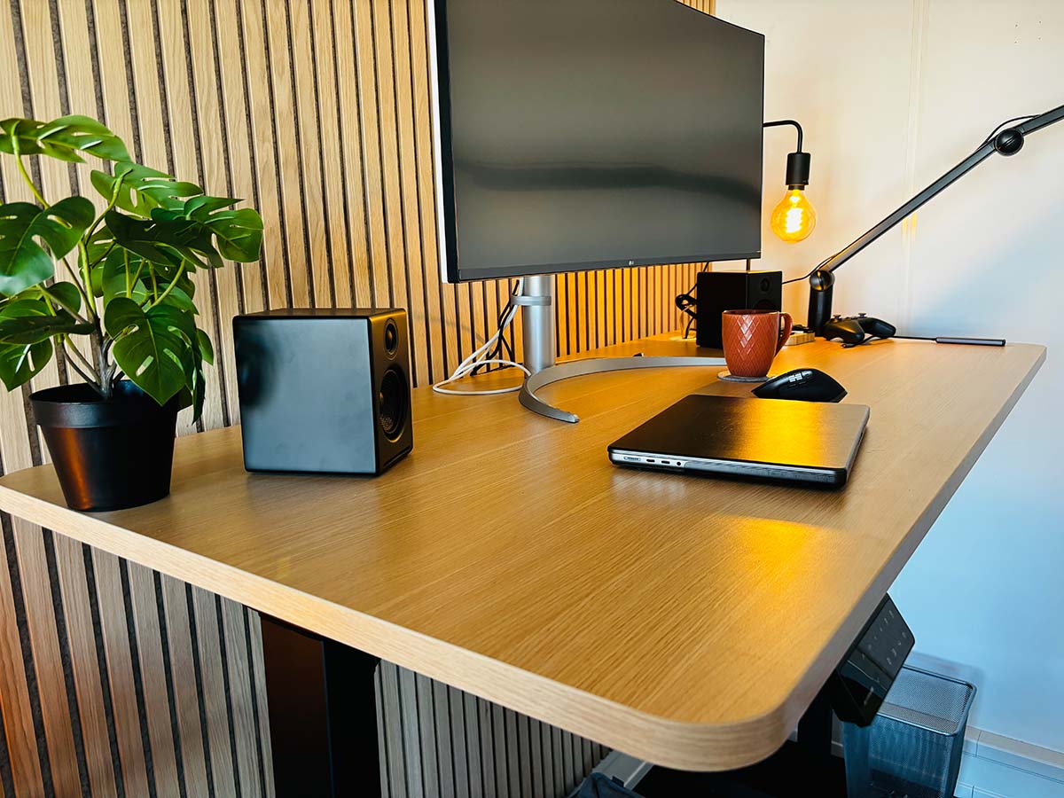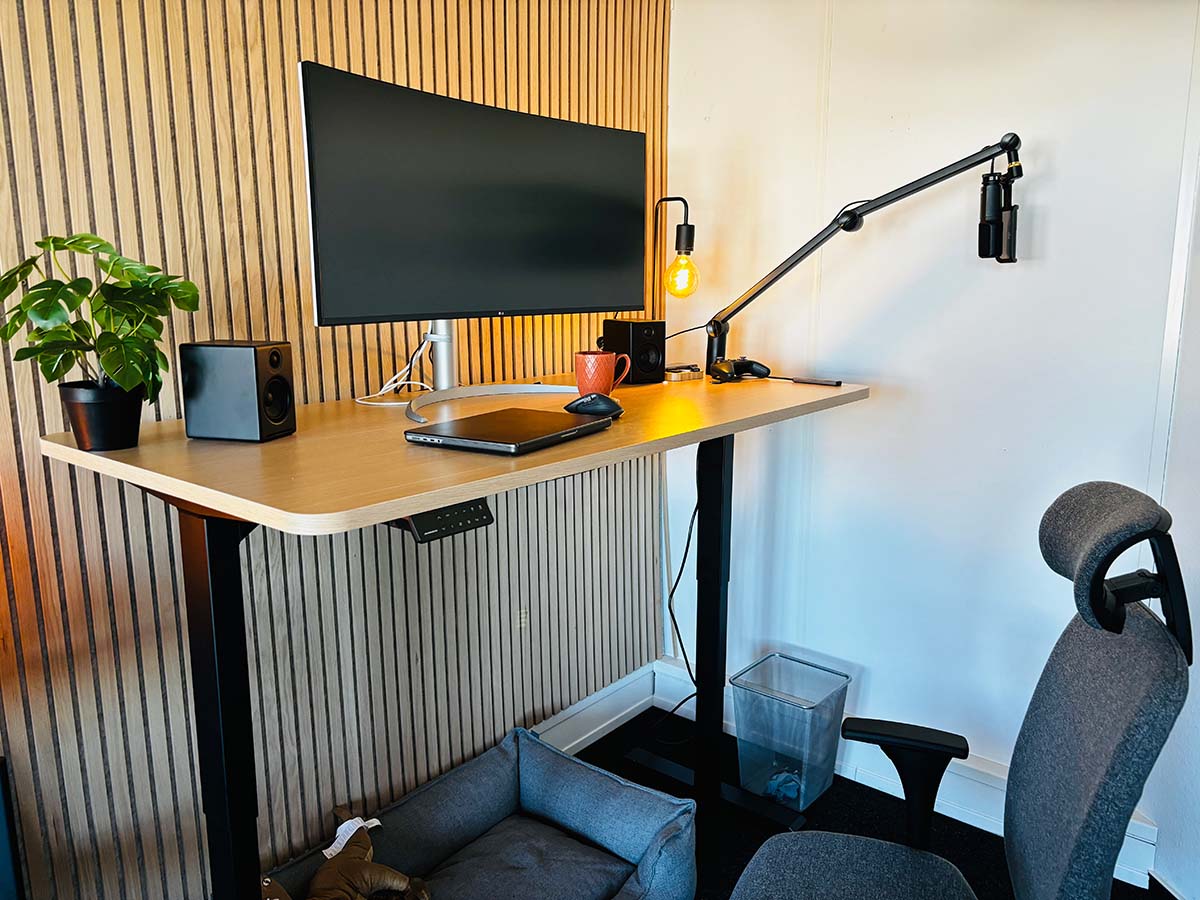 Ein höhenverstellbarer Schreibtisch bietet eine Vielzahl von Vorteilen, die sowohl die Gesundheit als auch die Produktivität steigern können. Einer der größten Vorteile ist die Flexibilität, zwischen Sitzen und Stehen wechseln zu können. Dies fördert die Bewegung und verhindert, dass man über längere Zeiträume in derselben Position verharrt, was wiederum Verspannungen und Beschwerden im Rücken, Nacken oder den Beinen reduzieren kann. Darüber hinaus zeigen Studien, dass regelmäßiges Stehen den Kreislauf anregt und die Müdigkeit verringert, was zu einer besseren Konzentration und höherer Leistungsfähigkeit führen kann. Außerdem ermöglicht ein höhenverstellbarer Schreibtisch eine individuelle Anpassung an unterschiedliche Körpergrößen oder Aufgaben, wodurch ein ergonomischer Arbeitsplatz geschaffen wird. Nicht zuletzt kann der Wechsel zwischen Sitzen und Stehen dazu beitragen, das Risiko von gesundheitlichen Problemen wie Herz-Kreislauf-Erkrankungen oder Diabetes zu senken. Alles in allem ist ein höhenverstellbarer Schreibtisch eine wertvolle Investition in die körperliche und geistige Gesundheit sowie in die Arbeitsproduktivität. Da ich selbst schon recht lange an einem höhenverstellbaren Schreibtisch arbeite, wollte ich diese Vorzüge auch im Studio nicht missen.