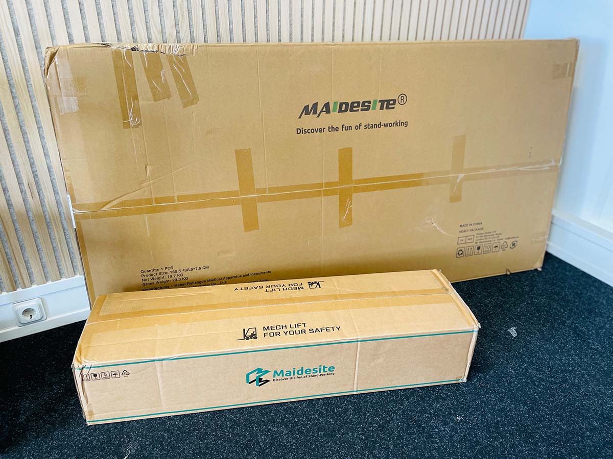 Im Online–Shop von Maidesite kann man den Schreibtisch in verschiedenen Varianten zusammenstellen. Schwarze oder weiße Tischbeine sowie eine große Auswahl an unterschiedlichen Tischplatten. Nach der Bestellung wird der Maidesite S2 Pro Plus und zwei Paketen geliefert. Einmal Tischplatte und die Tischbeine mit allem, was für die Montage benötigt wird.