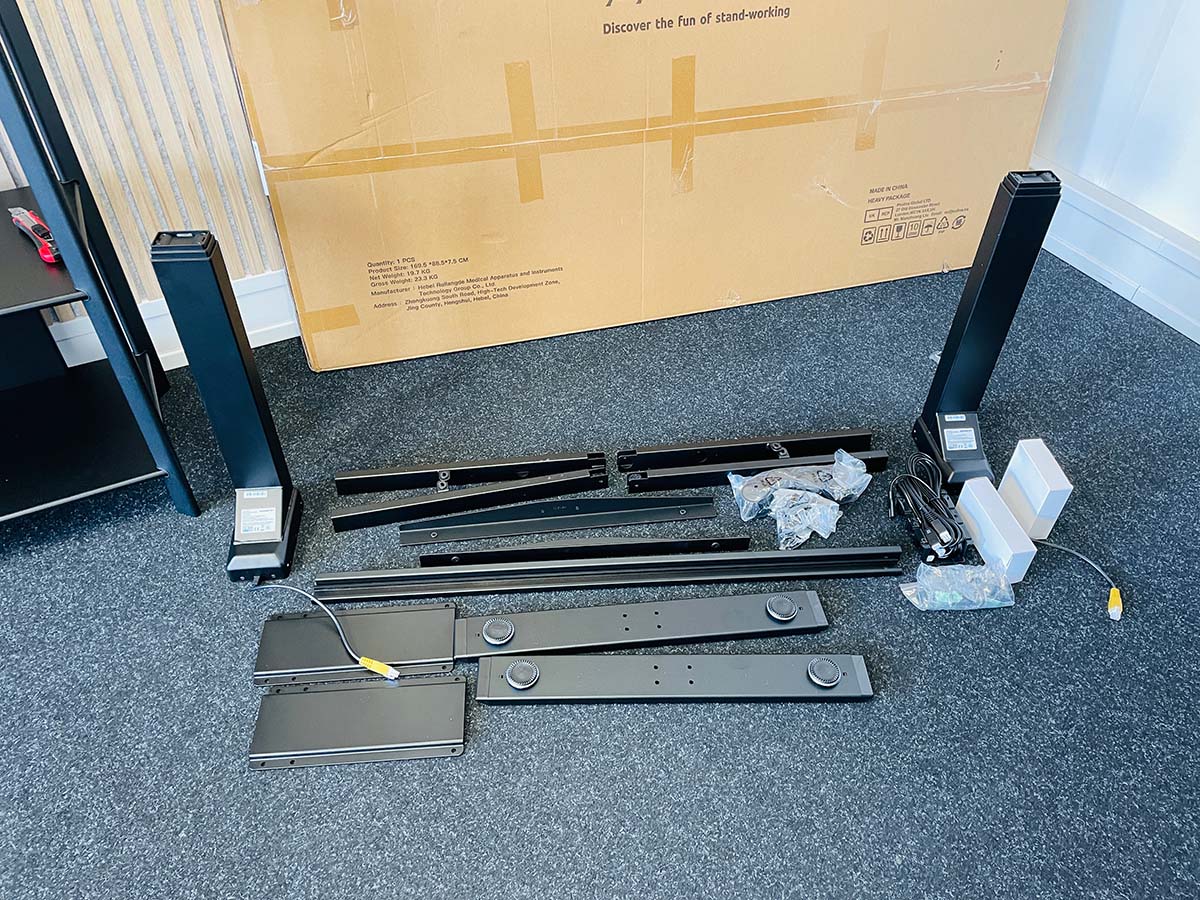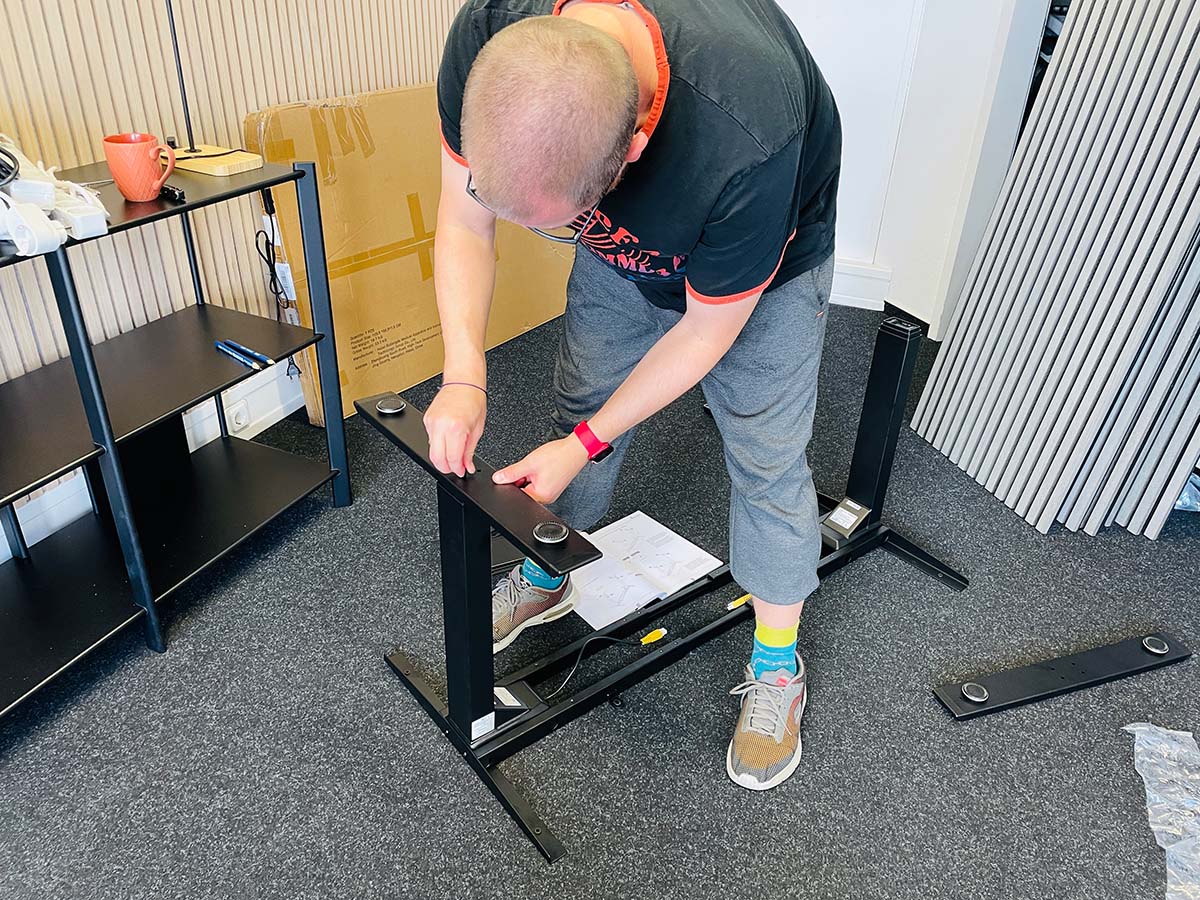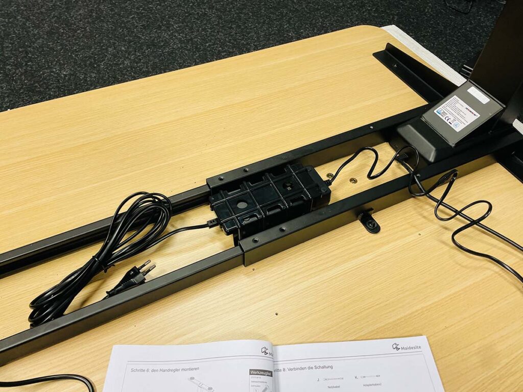Ich habe den Schreibtisch komplett alleine aufgebaut und dafür ungefähr 45 Minuten gebraucht. Wenn möglich würde ich empfehlen, den Schreibtisch zu zweit aufzubauen, da einige Arbeitsschritte, wie zum Beispiel die Platzierung der Tischbeine auf der Tischplatte, dann doch deutlich einfacher von der Hand gehen. Sind die Tischbeine zusammengeschraubt und mit der Tischplatte verschraubt, geht es an die Verkabelung. Die Motoren der Tischbeine werden mit Strom versorgt und mit dem Bedienfeld verbunden, um später die Höhe des Schreibtisches individuell einzustellen.