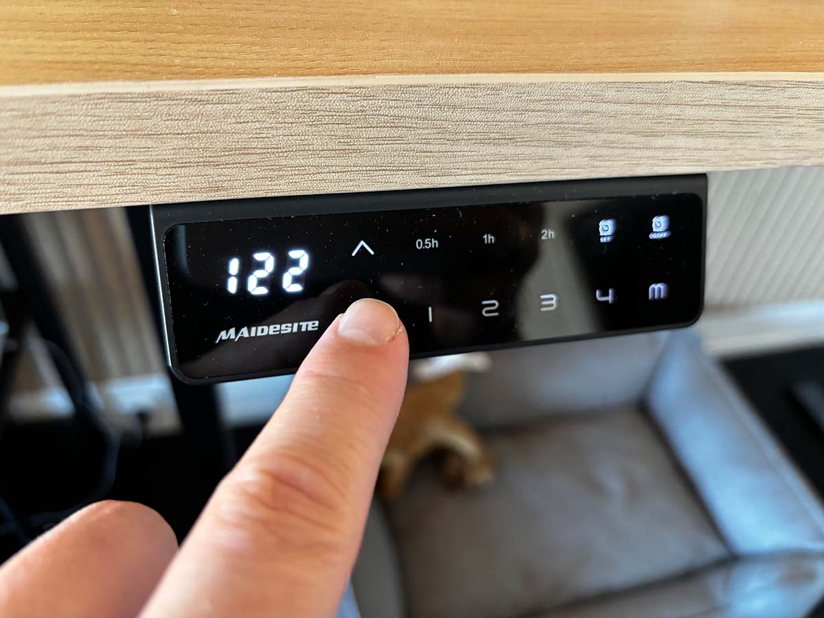 Ist der Schreibtisch fertig zusammengebaut, kann er über das Bedienelement mit Display ganz einfach auf die passende Größe eingestellt werden. Zudem lassen sich verschiedene Positionen speichern, sodass der Schreibtisch mit nur einem Klick automatisch an die gewünschte Position fährt. Der Motor hebt und senkt die Tischplatte schnell mit 40 mm pro Sekunde und ist zudem angenehm leise.