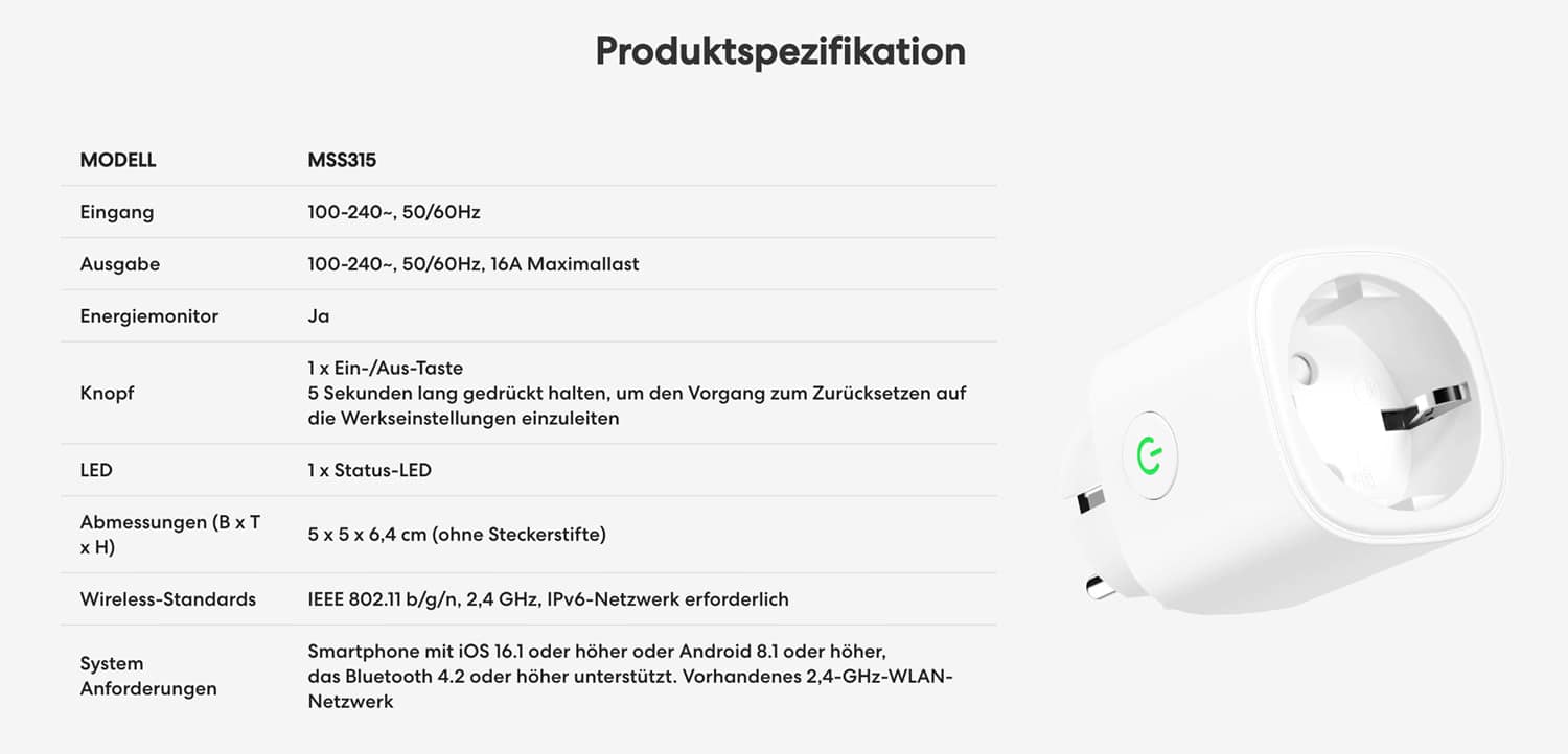 Die neue 5 x 5x 6,4 cm große Steckdose hat den neuen Smart Home Standard Matter der CSA, der auch Apple, Amazon, Google, Samsung und hunderte weitere Anbieter smarter Produkte angehören, mit an Bord. Die Steckdose hat einen integrierten Stromzähler, der dir genaustens übermittelt, wie hoch dein Verbrauch ist. Mittels Matter-Code lässt sie sich ganz einfach einrichten. Systemvoraussetzungen sind iOS 16.1 und Android 8.1. Sie funktioniert via Bluetooth und 2,4 GHz-WLAN.