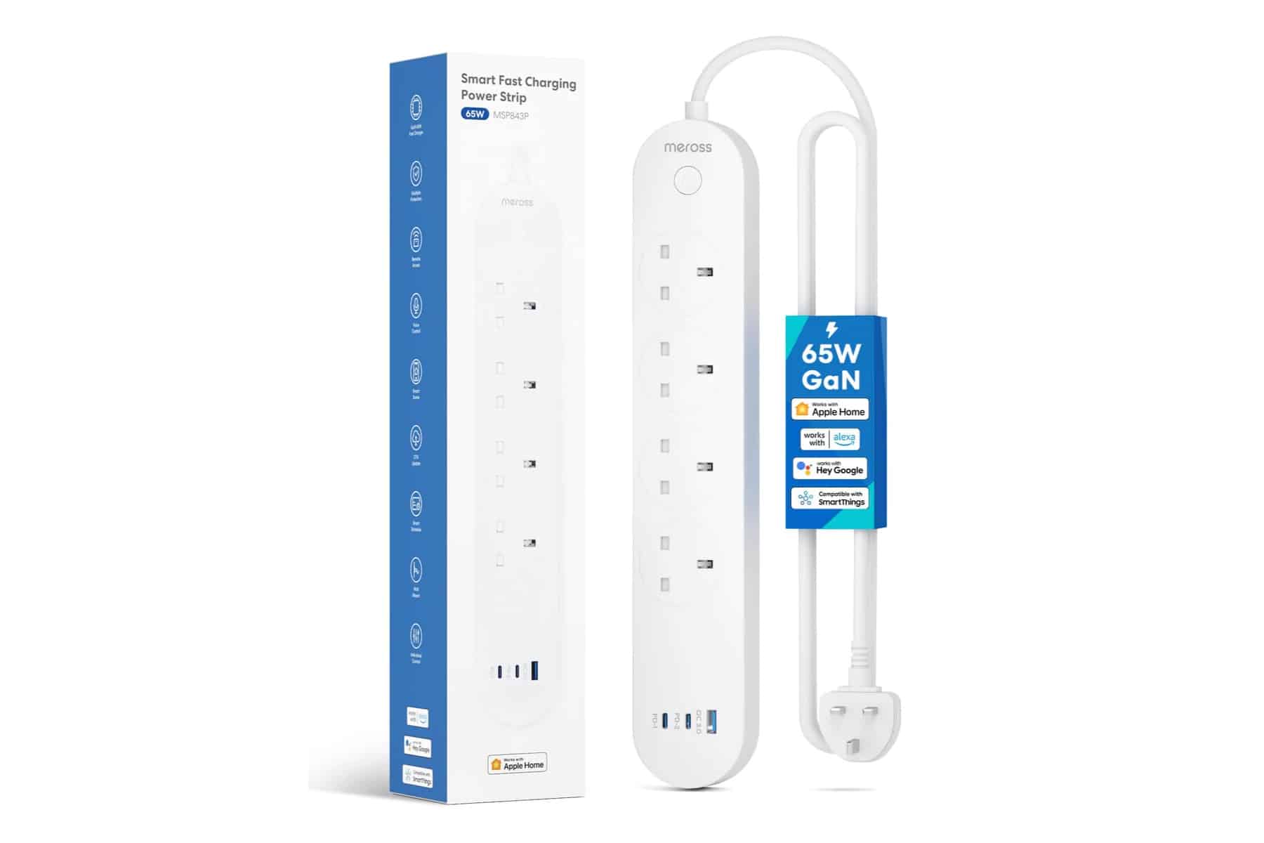 Es gibt auch einen USB-A-Steckplatz und zwei USB-C-Anschlüsse, die mit der GaN-III-Technologie ausgestattet sind. Sie liefern eine maximale Ausgangsleistung von 65W und können damit auch größere Geräte schnell aufladen. Support für HomeKit und Alexa ist selbstverständlich an Bord. Ein Hub ist nicht erforderlich.