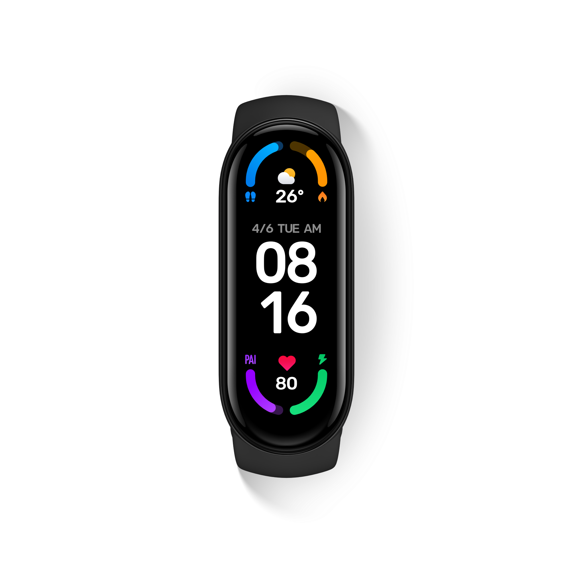Das Band hat ein 1,56 Zoll großes AMOLED-Display mit einer Auflösung von 152 x 486 Pixel. Neben Schlaftracking, Stresslevelmessung, Atemübungen, PAI und SpO2-Messung bietet das neue Mi Band 6 die Möglichkeit die Kamera des verbundenen Smartphones zu steuern.