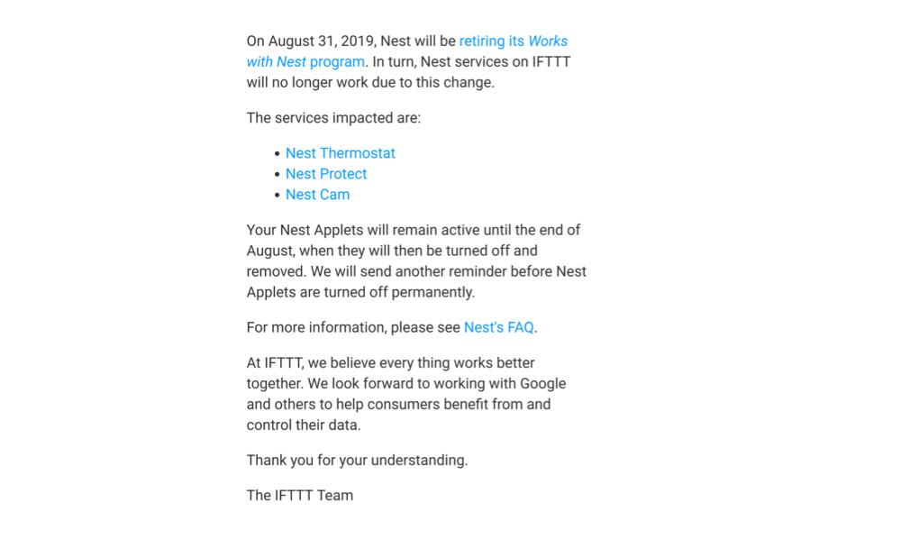 Das Ganze kommt nun dadurch zustande, dass Google die Plattform „Works with Nest“ einstellt. Diese Plattform wurde nämlich bisher für die Einbindung der Geräte in IFTTT genutzt.