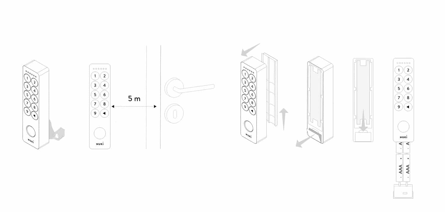 Die Anbringung stellt sich als sehr einfach heraus. Das Nuki Keypad 2.0 wird einfach auf eine glatte Oberfläche geklebt und wieder entfernt, wenn ein Batteriewechsel ansteht. Vier AAA-Batterien werden eingesetzt und halten ganze 12 Monate Betrieb durch.