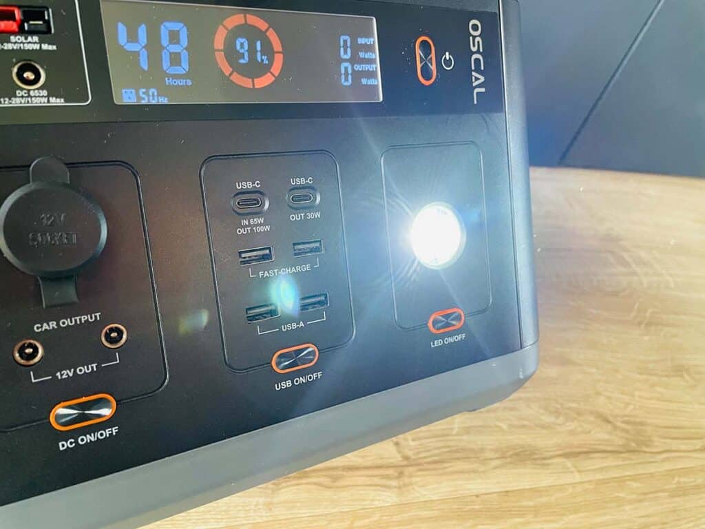 Das Display an der Front zeigt alle wichtigen Informationen der Power Station an. Man sieht den Ladestand in Prozent, die aktuelle Ein- bzw. Ausgangsleistung und die Anzahl der Stunden, welche mit den aktuell angeschlossenen Geräten geladen werden kann. Das LED-Licht an der Front ist praktisch, wenn ihr zum Beispiel mit dem Zelt unterwegs seid und nach Anbruch der Dunkelheit noch entspannt ein Buch lesen wollt.