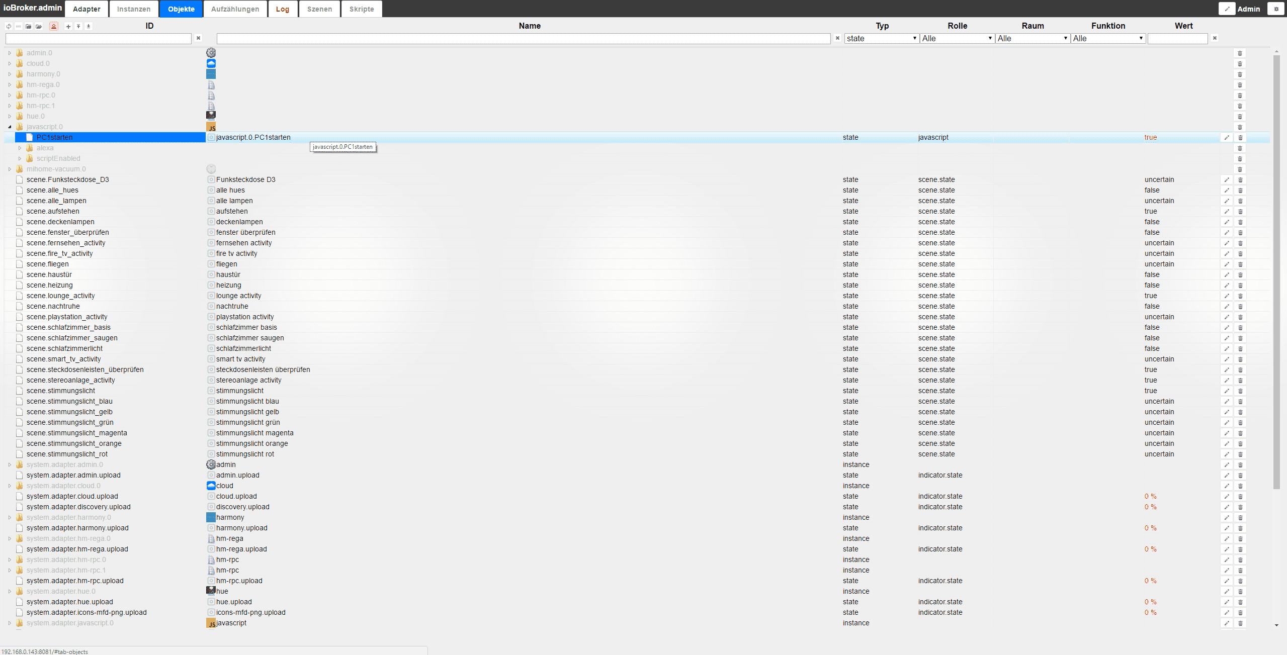 - Wechselt nun zum Tab der Objekte. Dort solltet ihr nun im Ordner „javascript.0“ den neu angelegten Punkt „PCanschalten“ finden.