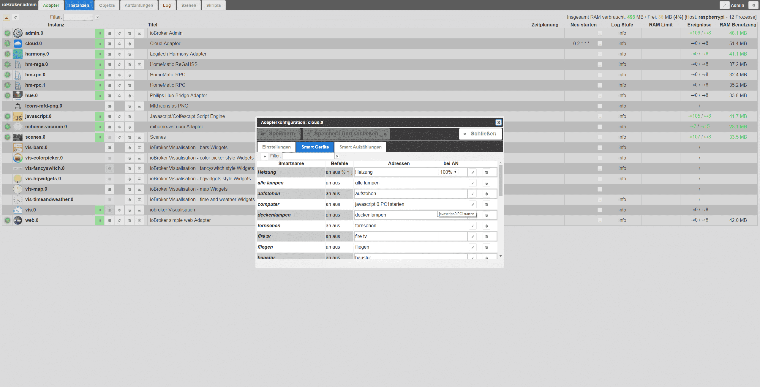 - Im letzten Schritt müsst ihr noch im Tab der Instanzen in die Konfiguration des Cloud Adapters. Sollte der Punkt javascript.0.PCanschalten noch nicht automatisch generiert sein, fügt ihn manuell über das + hinzu.