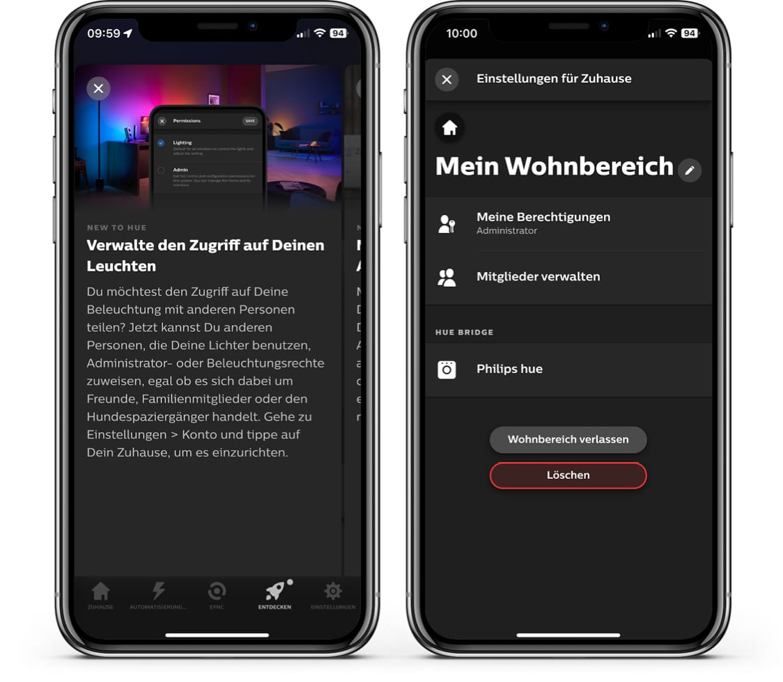 Du kannst jetzt durch die neue Mitgliederverwaltung deine Adminrechte mit anderen Personen teilen. Ebenso lassen sich Lampeneinstellungen ändern, wenn du nicht alle Rechte abgeben möchtest. Im Entdecken-Bereich der Hue-App ist ein entsprechender Hinweis aufgetaucht.