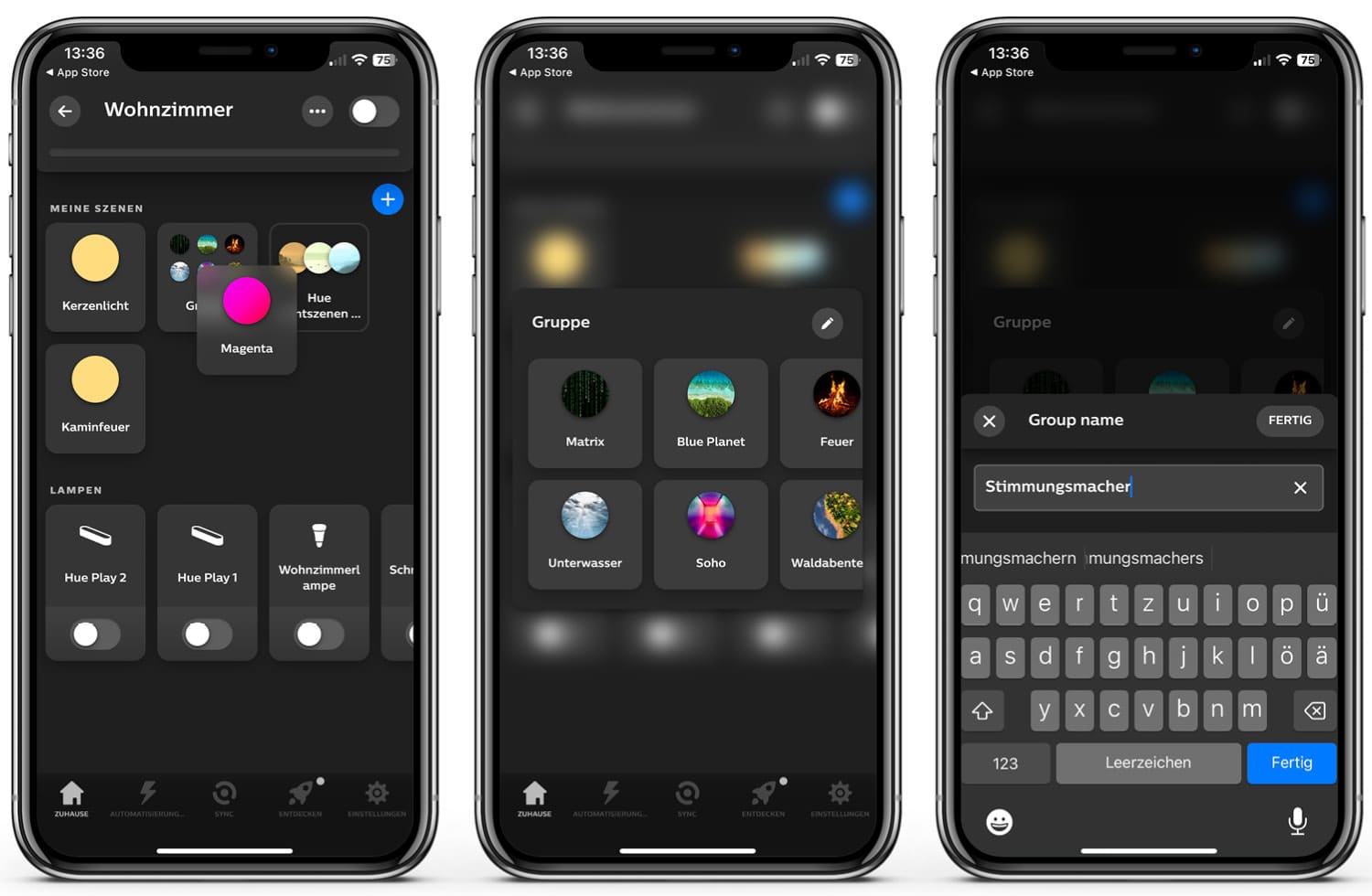Des Weiteren kannst du jetzt Szenengruppen erstellen und sie nach deinen Belieben anordnen. Dazu drücke einfach auf eine Szene und halte sie. Jetzt ziehst du die Sezene auf eine andere Szene und schon wird eine Gruppe erstellt, die du individuell benennen kannst.