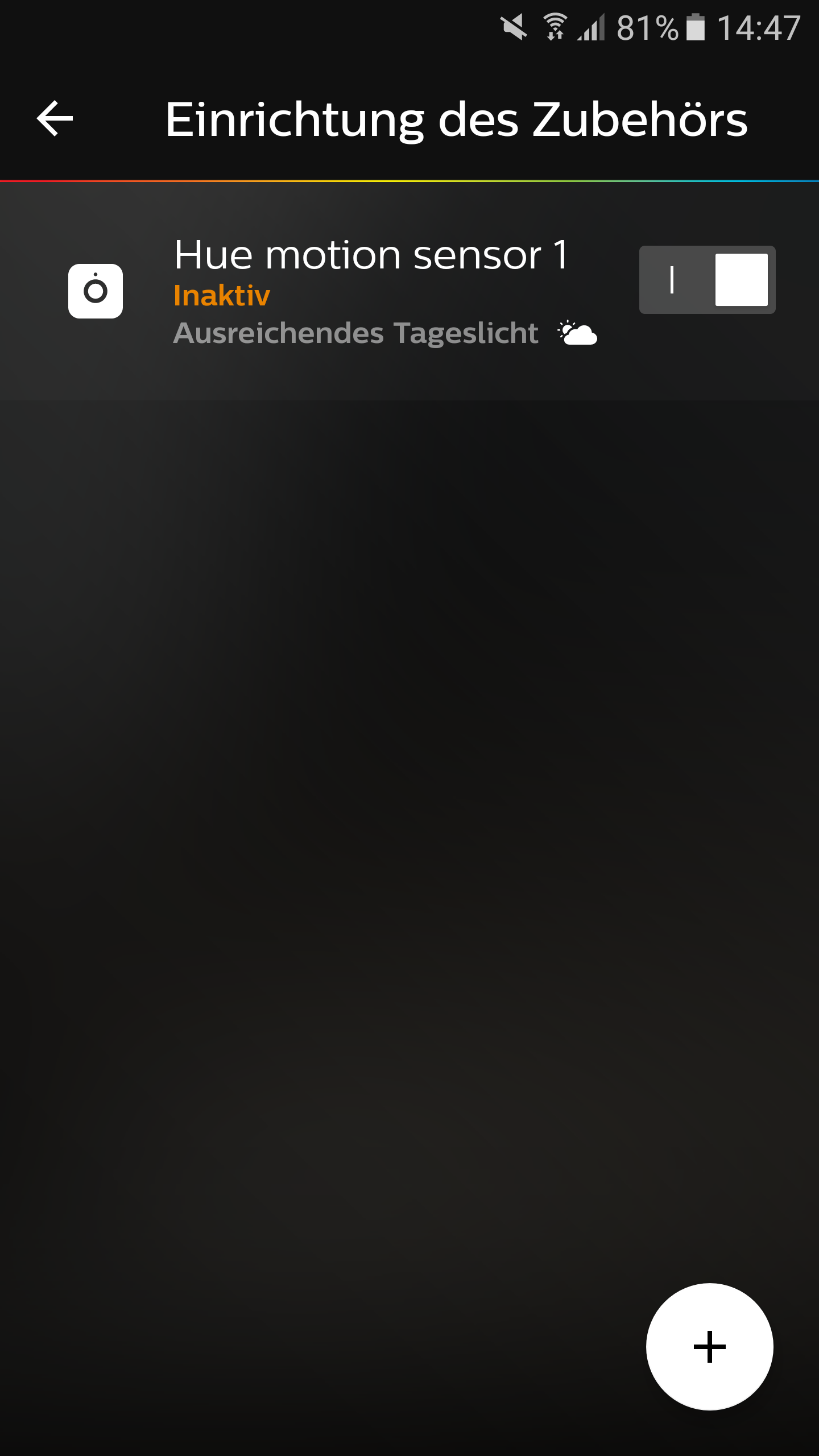 - Auf dem ersten Screenshot seht ihr den Bildschirm, auf dem ihr neue Geräte hinzufügen könnt bzw. in diesem Fall schon, wie der Philips Hue Bewegungsmelder bei mir hinzugefügt wurde.Das Wort „Inaktiv“ bedeutet hier, dass das Umgebungslicht hell genug ist und der Philips Hue Bewegungsmelder die Bewegungen ignoriert. Er soll seine Arbeit ja erst verrichten, wenn es dunkel genug ist.