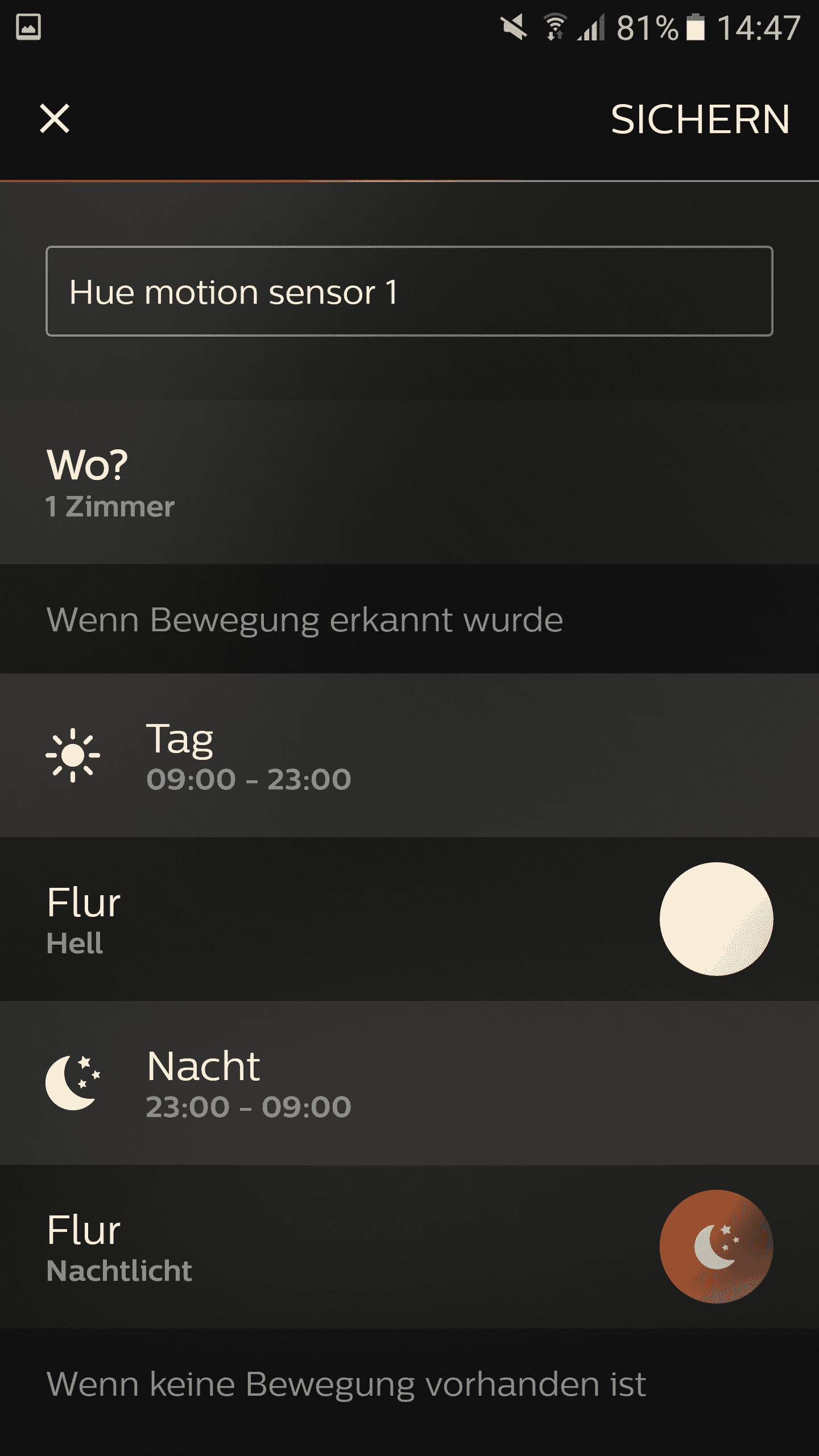 - Diesen Screen seht ihr, wenn ihr in die Einstellungen des Philips Hue Bewegungsmelders geht. Hier könnt ihr dem Gerät einen neuen Namen geben und eure Tag / Nacht Zeiten eingeben. Diese bestimmen daraufhin wann das Licht hell und wann es gedimmt anschaltet.