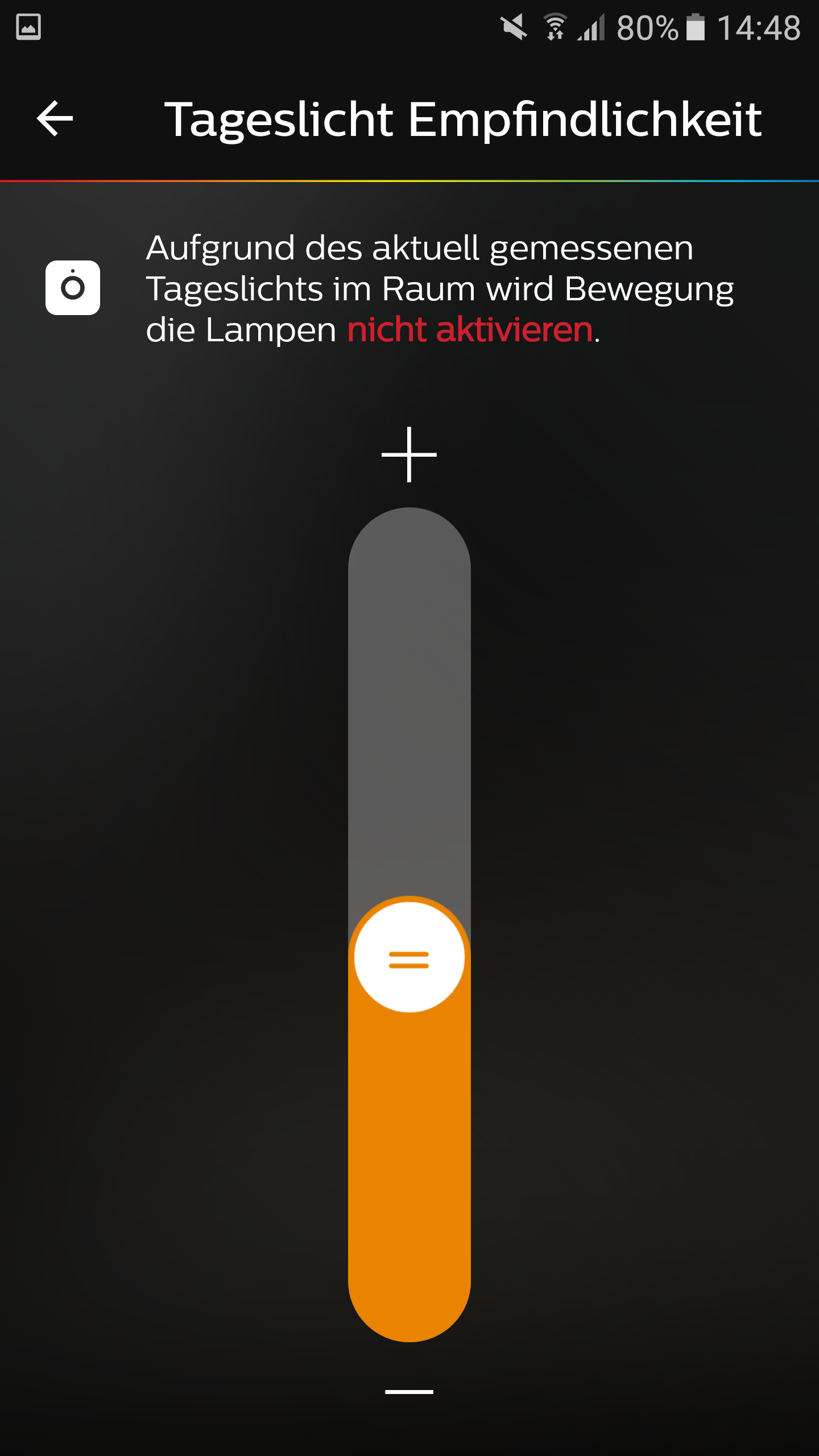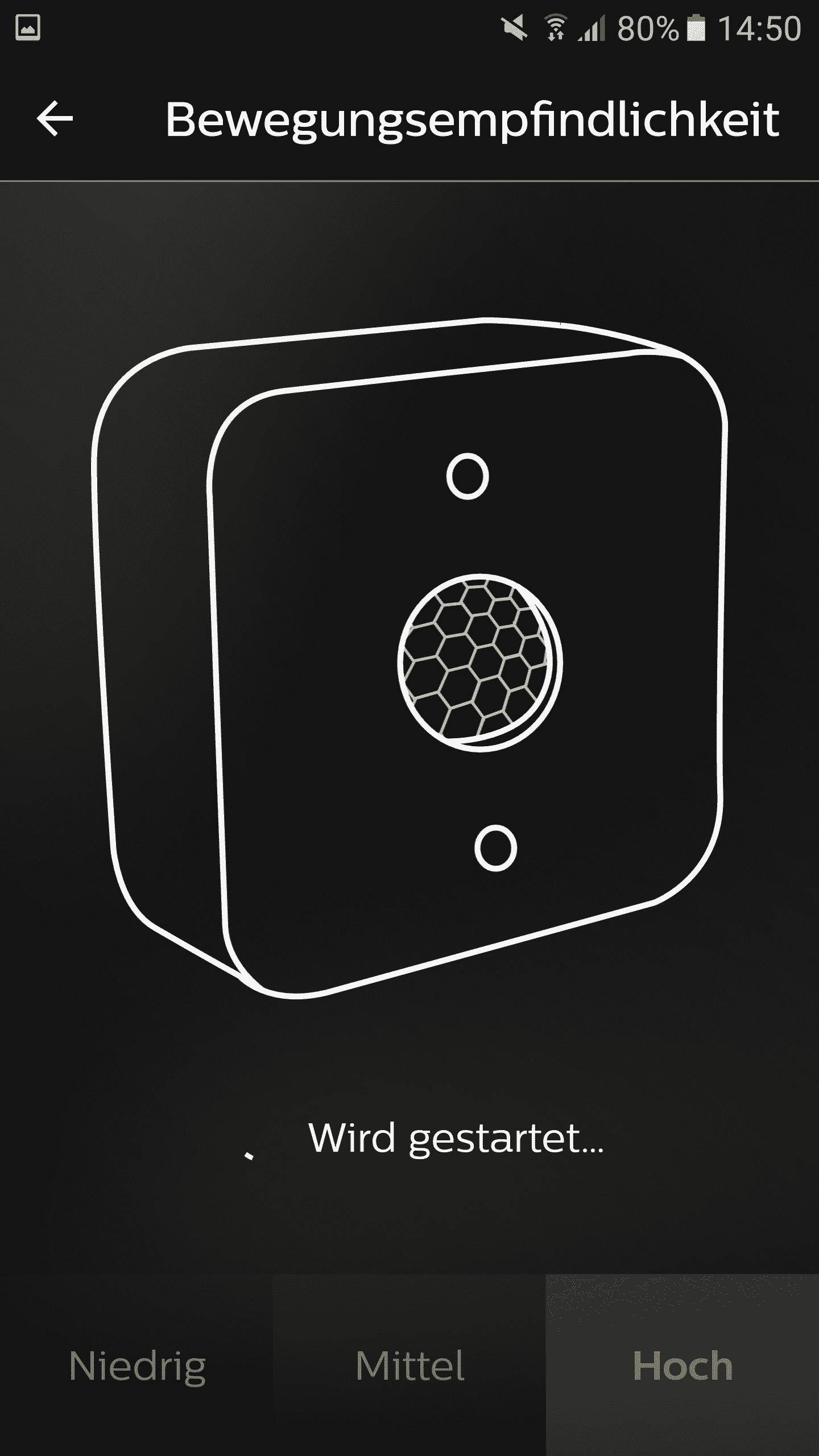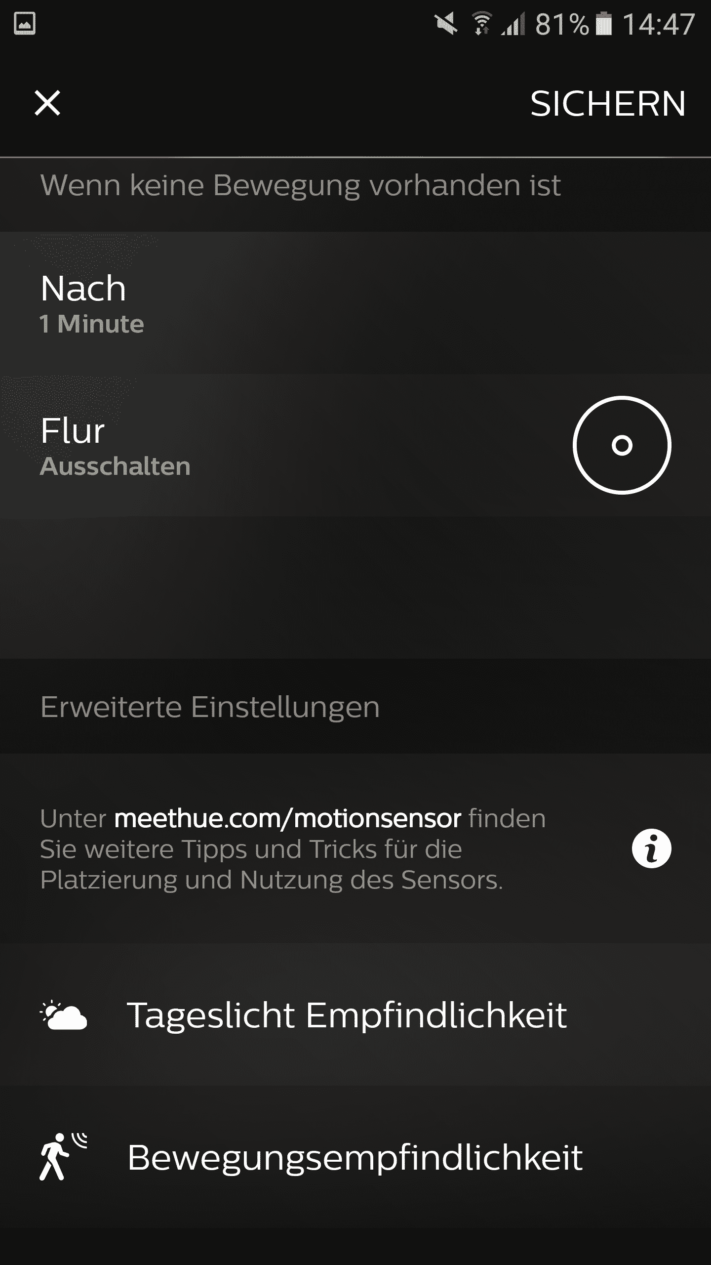 - Der letzte Screenshot zeigt nun noch, bei welcher Empfindlichkeit der Philips Hue Bewegungsmelder anspringt. Also ob er schon bei einer Mücke angehen soll oder erst wenn eine Elefant durch den Flur läuft 😉