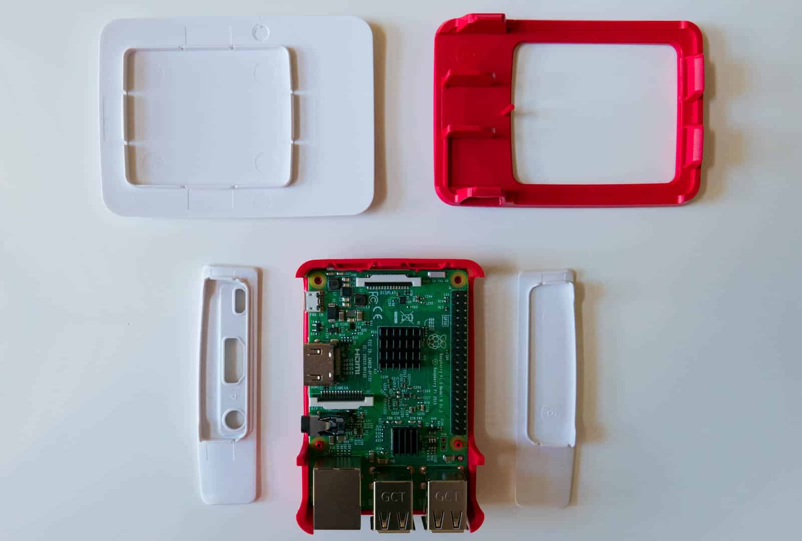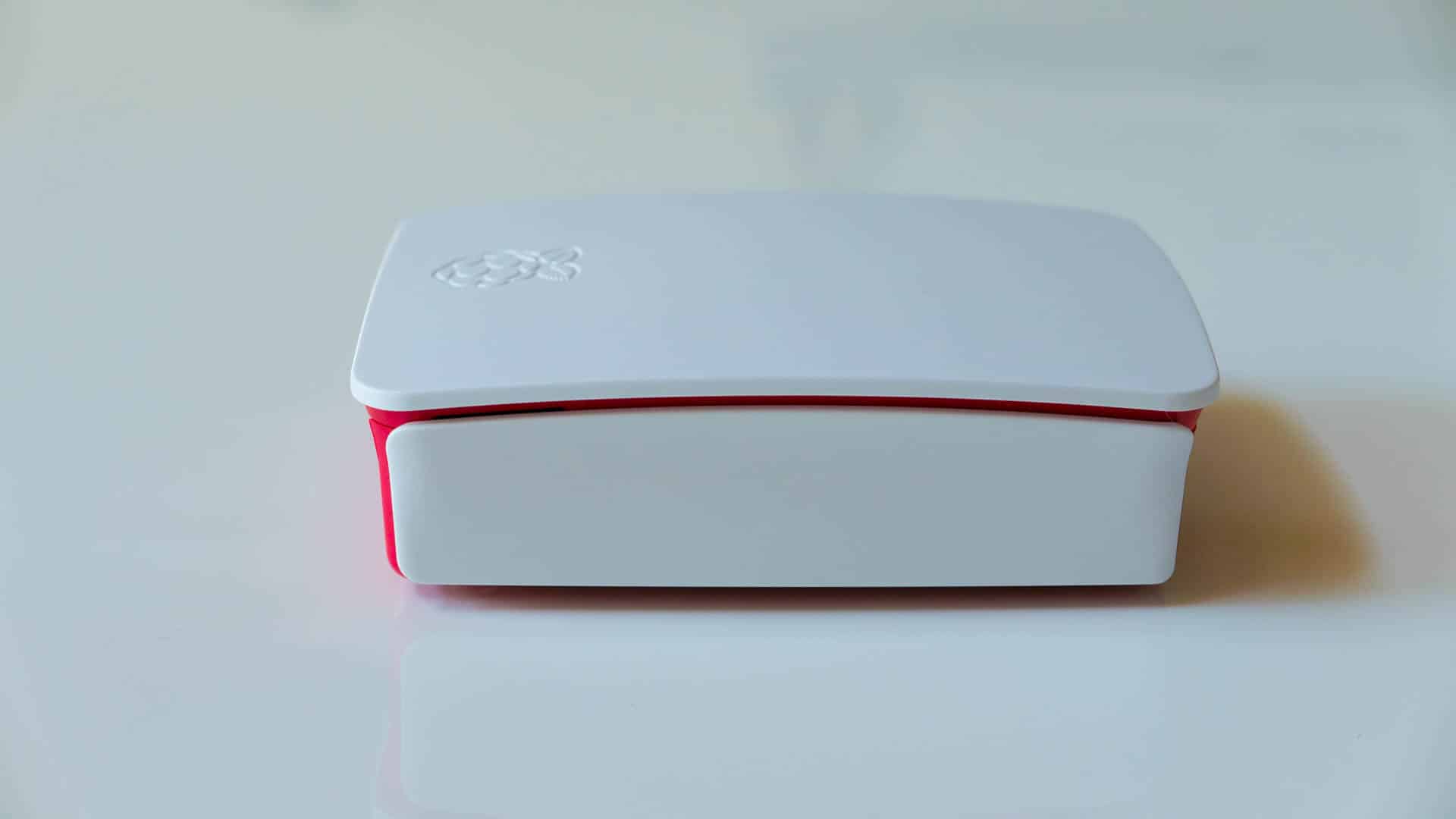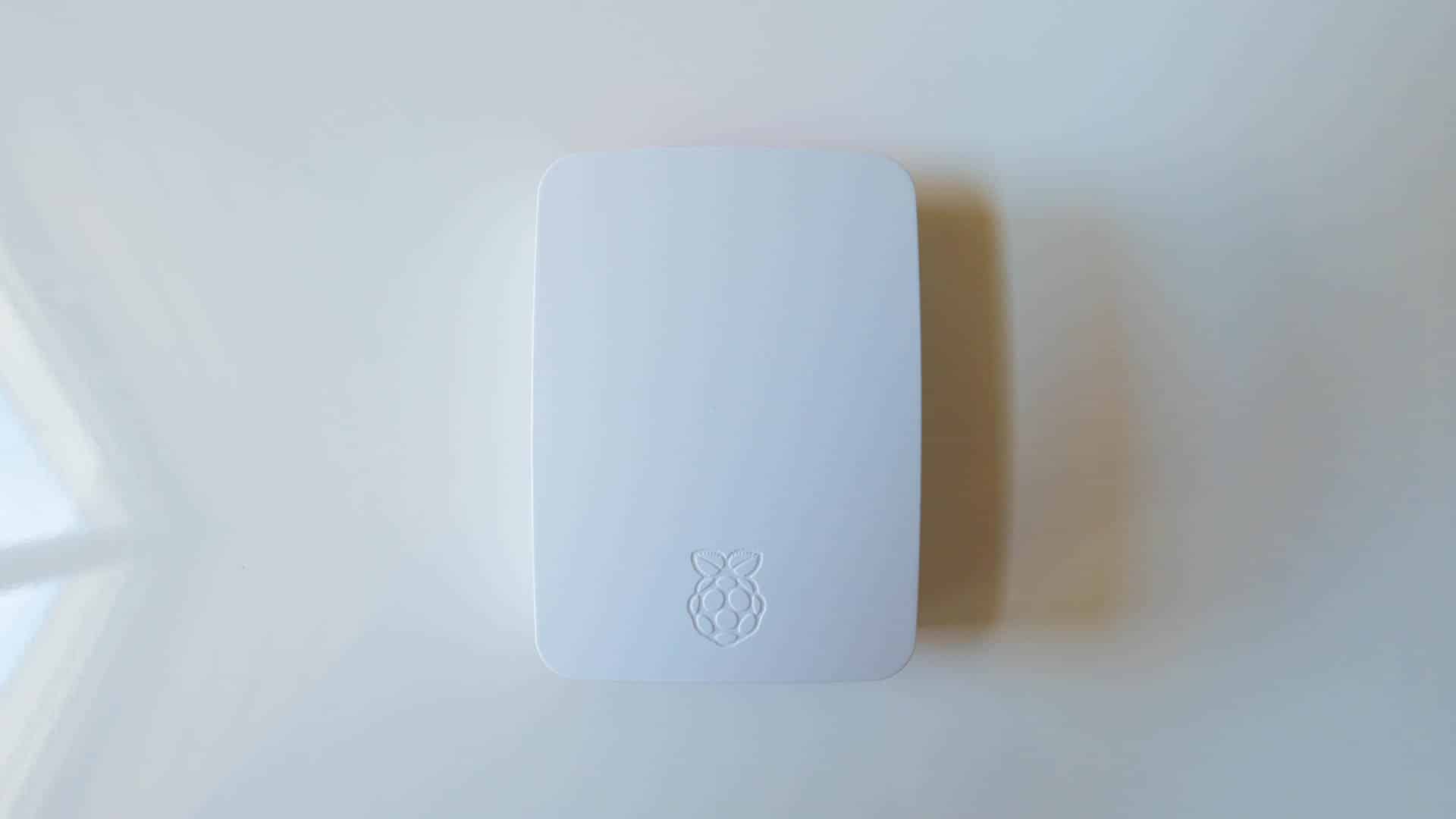 - Hier seht ihr nun nochmal aus der selben Perspektive den fertig zusammengebauten Raspberry Pi. Jetzt ist auch noch der letzte weiße Deckel aufgesetzt.