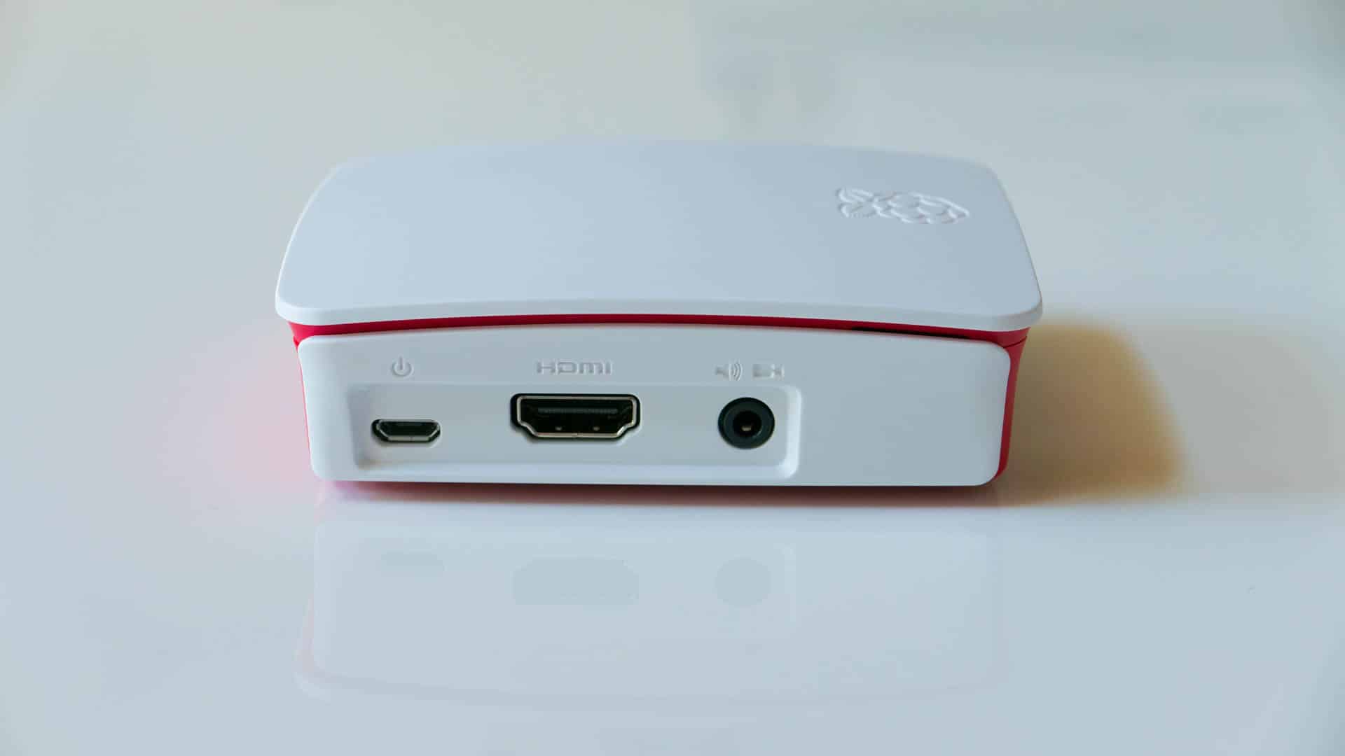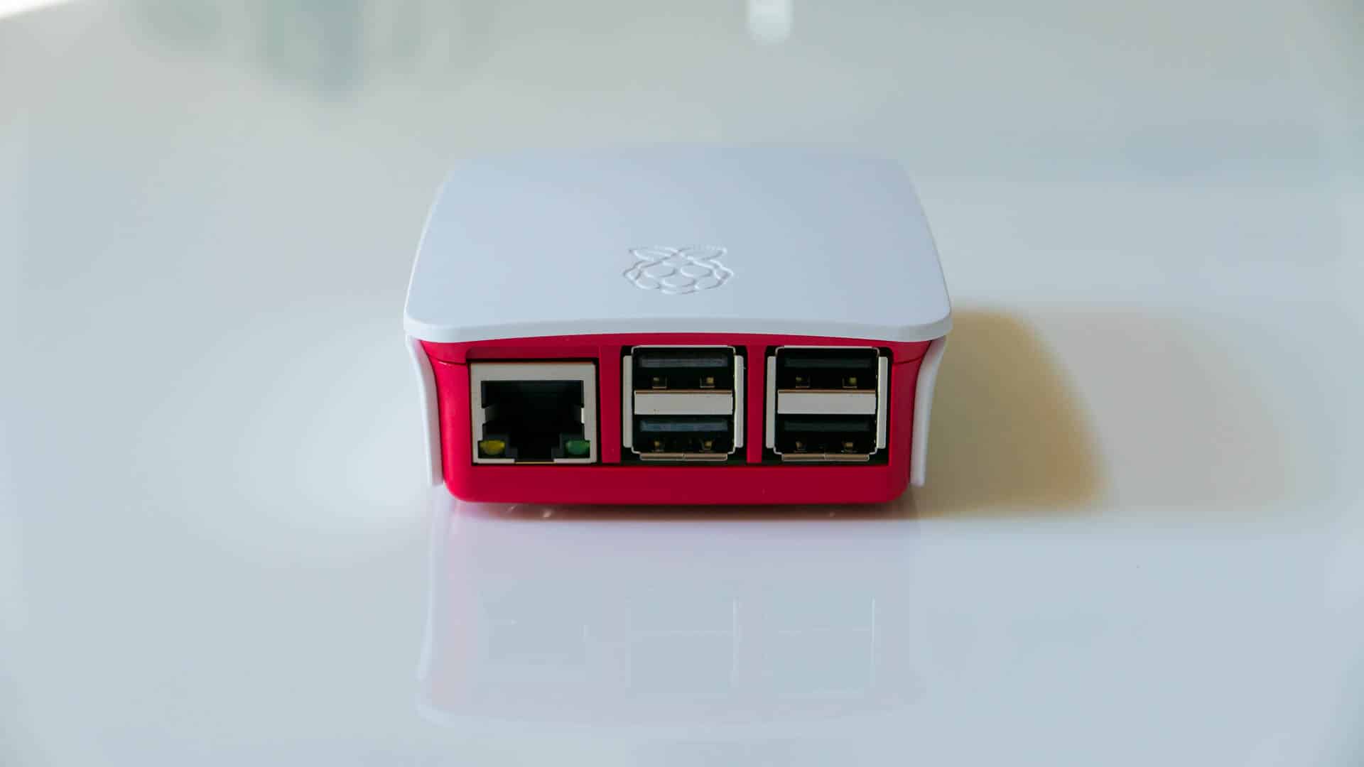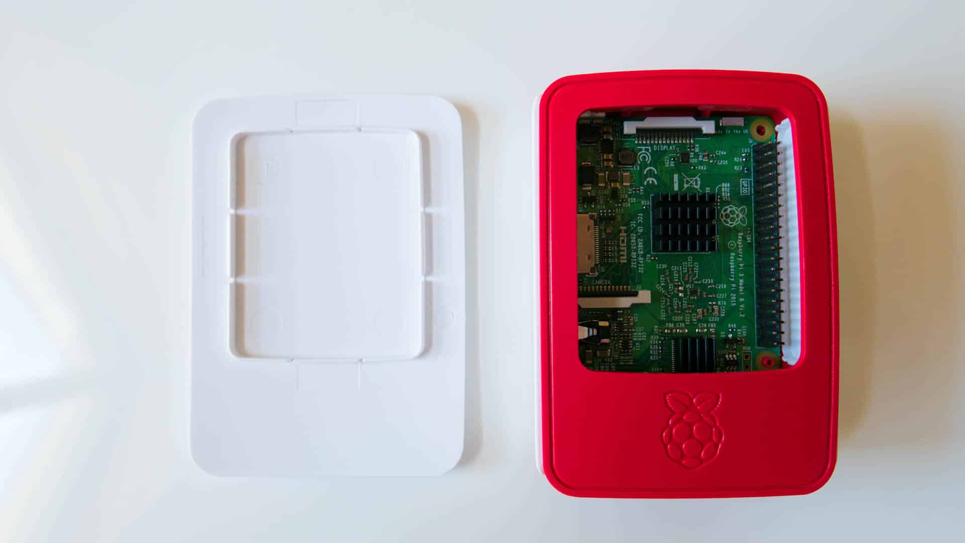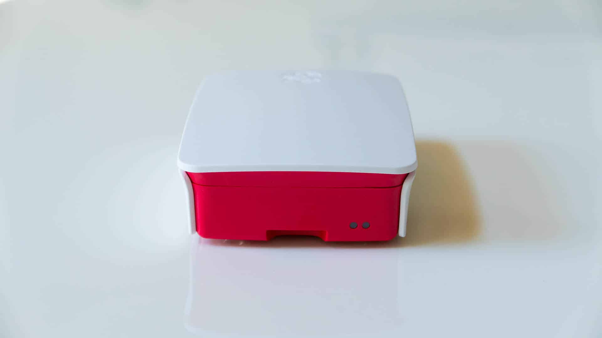 - Hier seht ihr nun nochmal aus der selben Perspektive den fertig zusammengebauten Raspberry Pi. Jetzt ist auch noch der letzte weiße Deckel aufgesetzt.