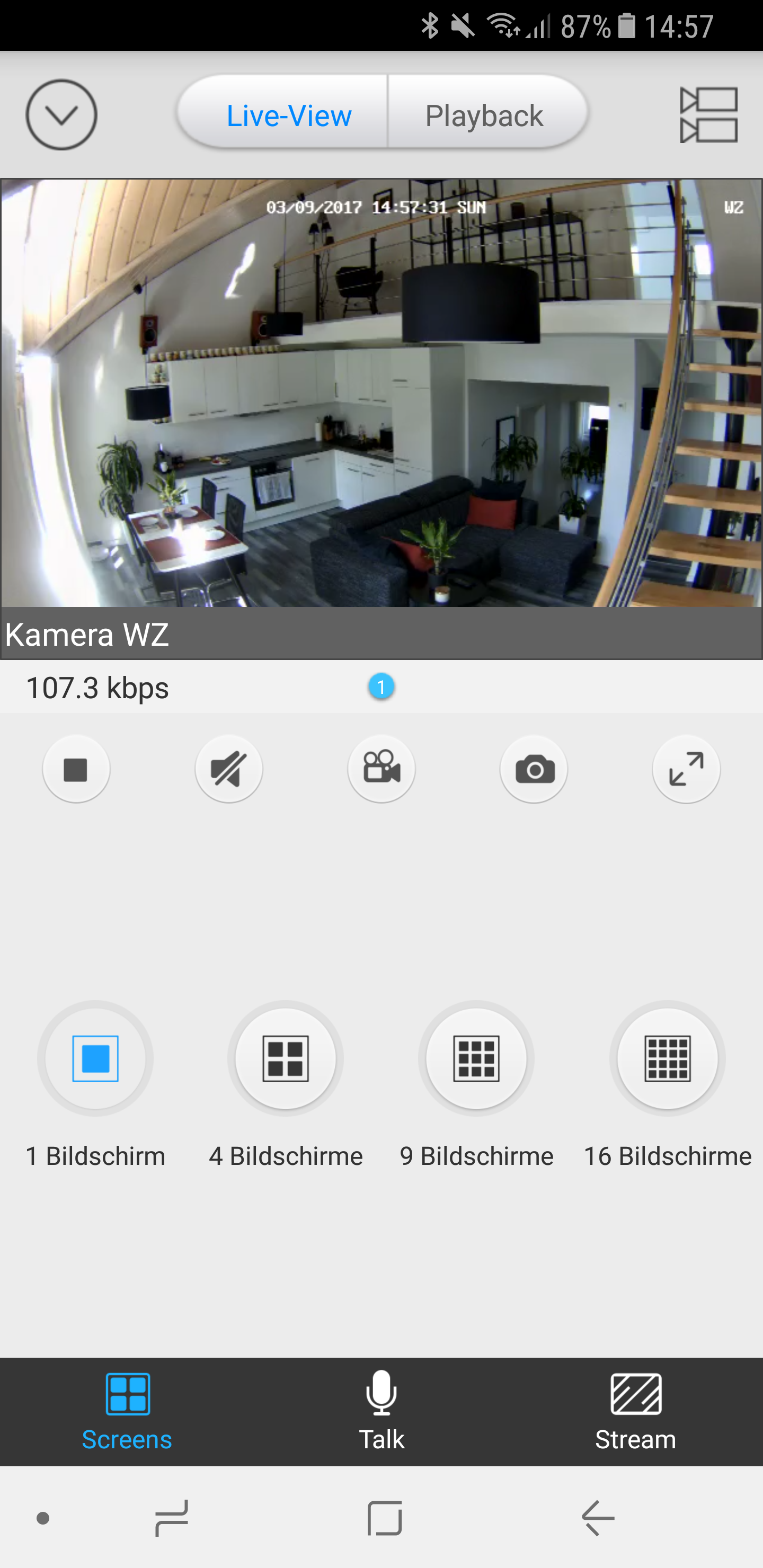 - Auf dem ersten Screenshot seht ihr den Start Screen. Dieser zeigt sich, nachdem ihr dir App geöffnet habt. Von hier aus könnt ihr die meisten Funktionen der Reolink Argus Kamera erreichen. Ihr könnt mehre Raster Ansichten einstellen, wenn ihr weitere Kameras in euer System integriert. Desweiteren könnt ihr auf den 5 kleineren Buttons im mittleren Bereich folgendes steuern: Live View starten/stoppen, Ton Übertragung starten/stoppen, Video aufzeichnen, Foto aufnehmen, Vollbild starten. Oben rechts auf dem Kamera Symbol, könnt ihr dann die jeweilige Kamera auswählen, die ihr angezeigt bekommen möchtet.