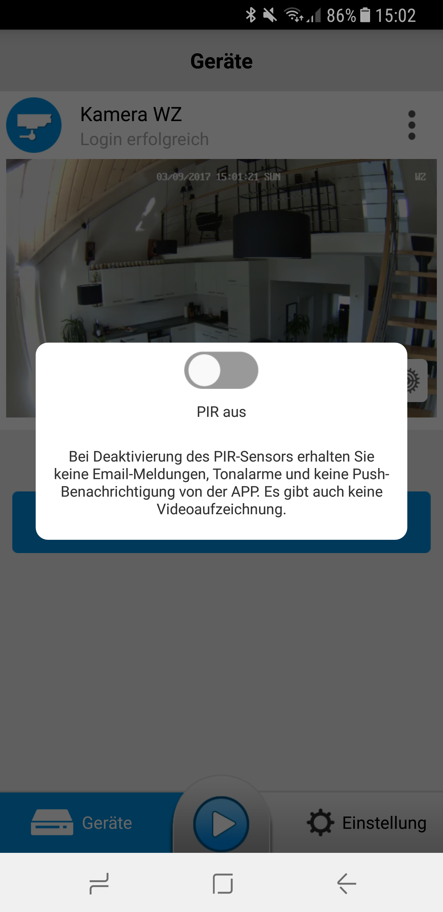 - Mit einem Klick auf das PIR Symbol, könnt ihr diese Funktion ein- und ausschalten. Dieser Modus ermöglicht es der Kamera dann, bei Bewegungen Videos aufzuzeichnen. Ihr könnt selbst entscheiden, ob ihr benachrichtigt werden wollt, ein Alarm ertönt oder ihr es einfach stumm lassen möchtet.