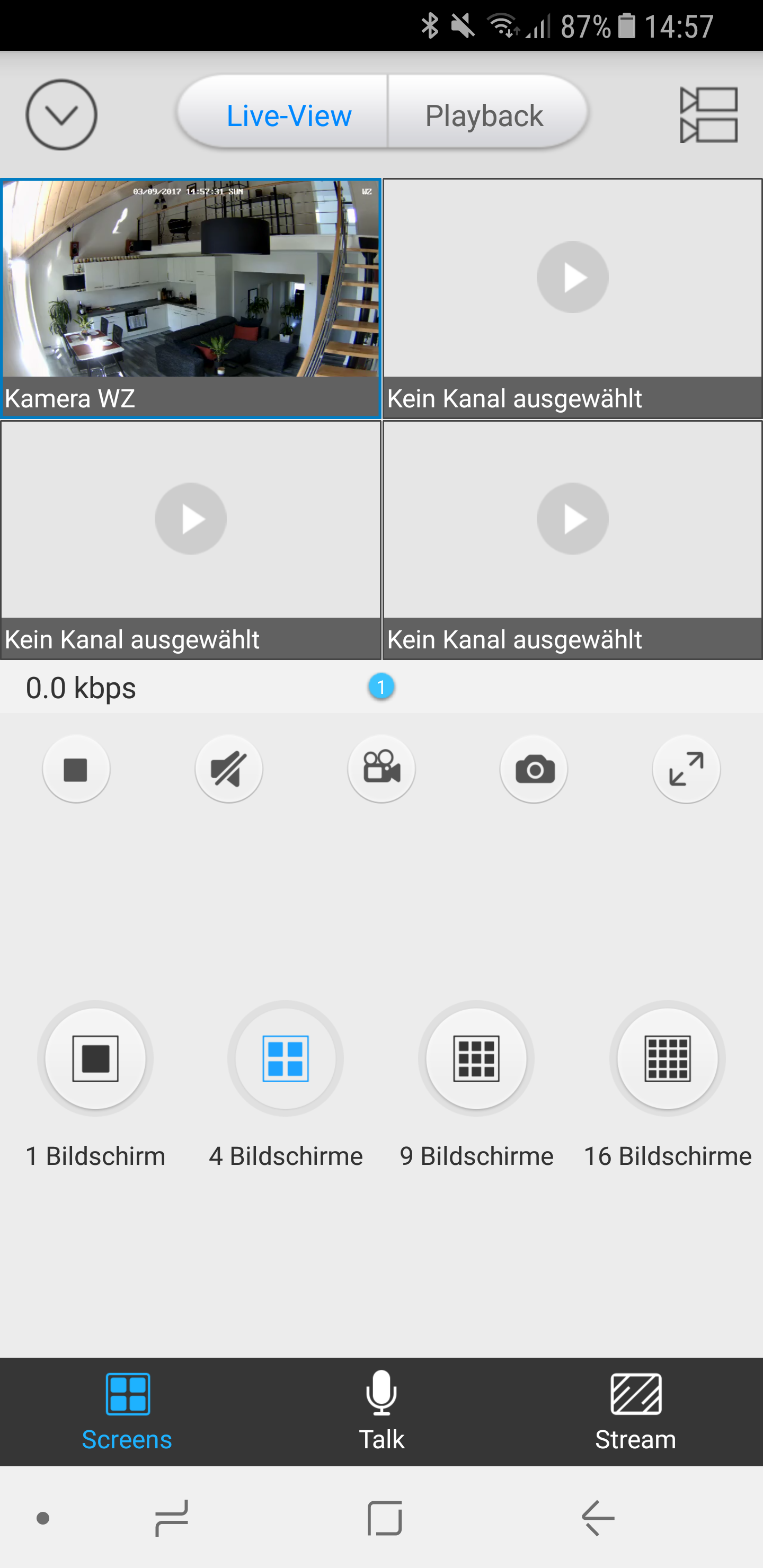 - Auf diesen Screen gelangt ihr, wenn ihr oben rechts auf das Kamerasymbol in der Übersicht klickt. Dort könnt ihr dann die gewünschten Kameras auswählen, von denen ihr die Video angezeigt bekommen möchtet.
