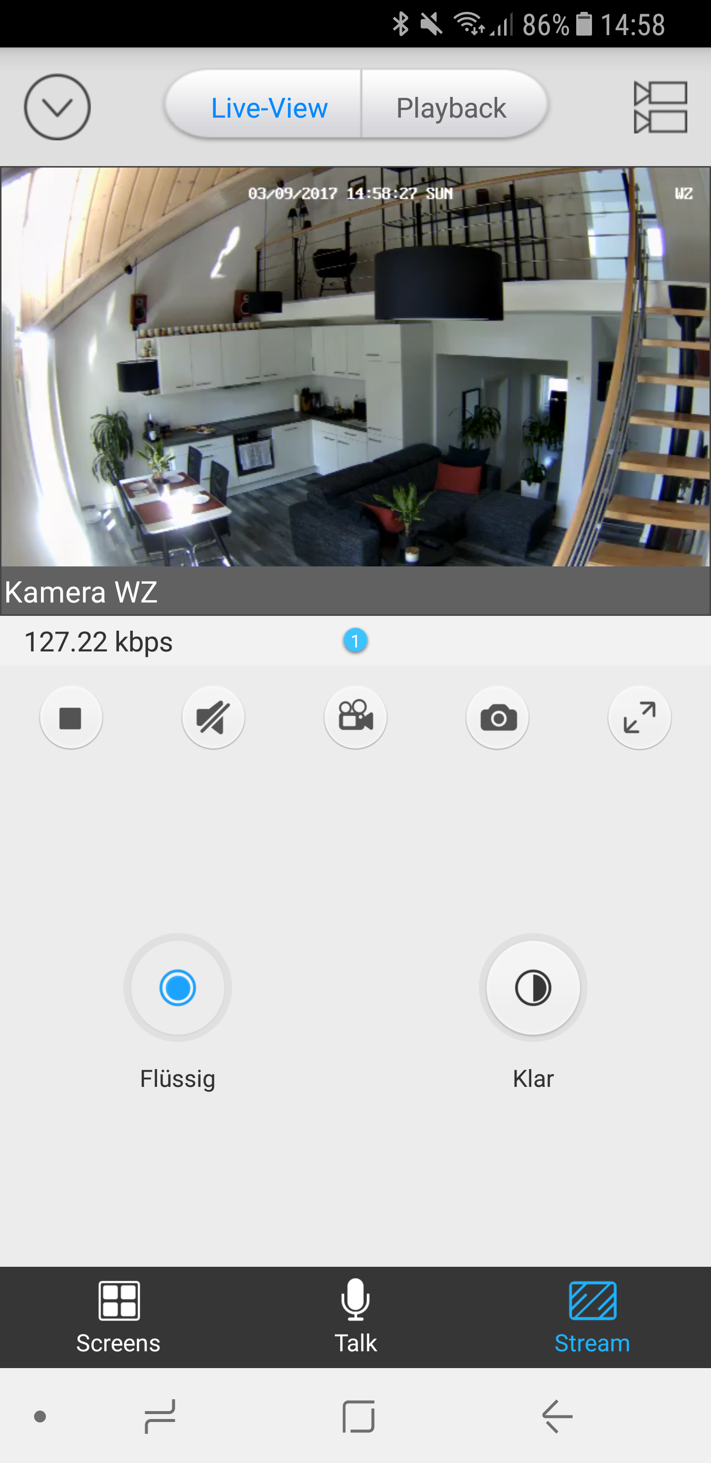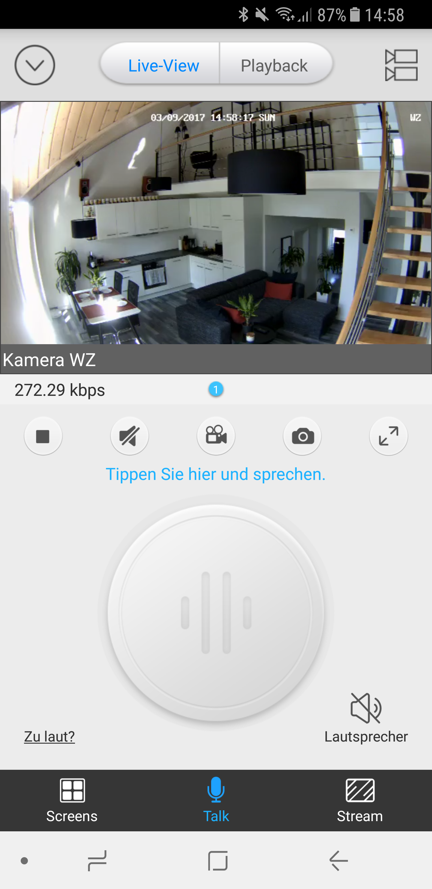 - In der unteren Leiste könnt ihr auf den Reiter „Talk“ wechseln. Dort könnt ihr dann den „Aufnahme Button“ drücken, in euer Smartphone sprechen und so den Ton über die Reolink Argus Kamera auszugeben.