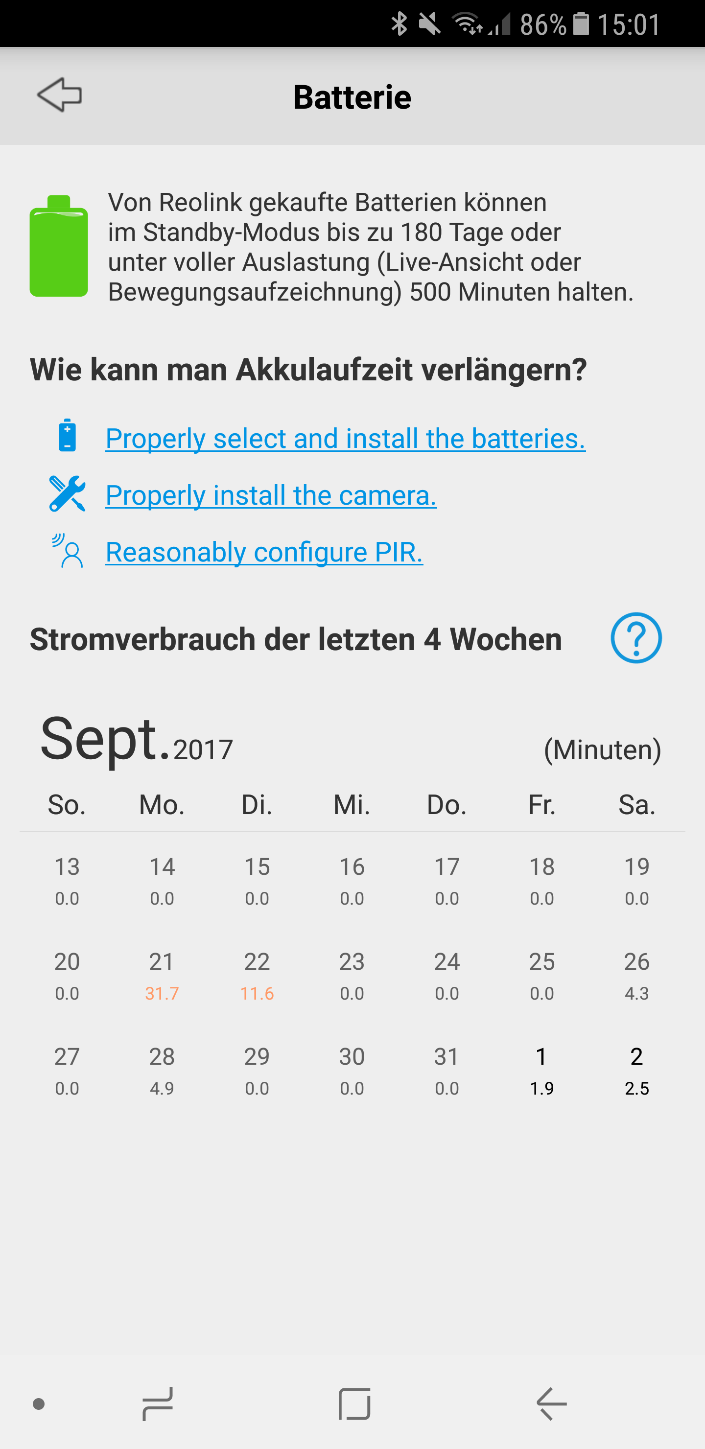 - Hier handelt es sich um die Übersicht des Batterieverbrauchs. Diesen könnt ihr einsehen, wenn ihr in der Vorschau auf das Batteriesymbol klickt. Ihr seht dann die Nutzungsdauer pro Tag in dem kleinen Kalender. Sollte die Batterie leer werden, bekommt ihr unterhalb der 10% Marke eine Warnung aufs Smartphone gepushed.