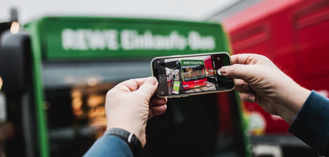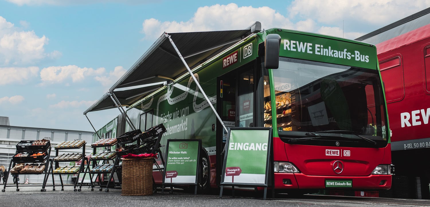 Viele Regionen und vor allem ländlichere Orte haben oftmals keinen eigenen Supermarkt vor Ort und müssen sich ins Auto oder in den Bus setzen, um einkaufen zu gehen. Rewe möchte dieses Problem jetzt aus der Welt schaffen und damit private Autofahrten reduzieren. Zusammen mit der Deutschen Bahn hat Rewe den Einkaufs-Bus entwickelt. Ein rollender Supermarkt, der mit über 700 Artikeln in kleine Orte fährt.