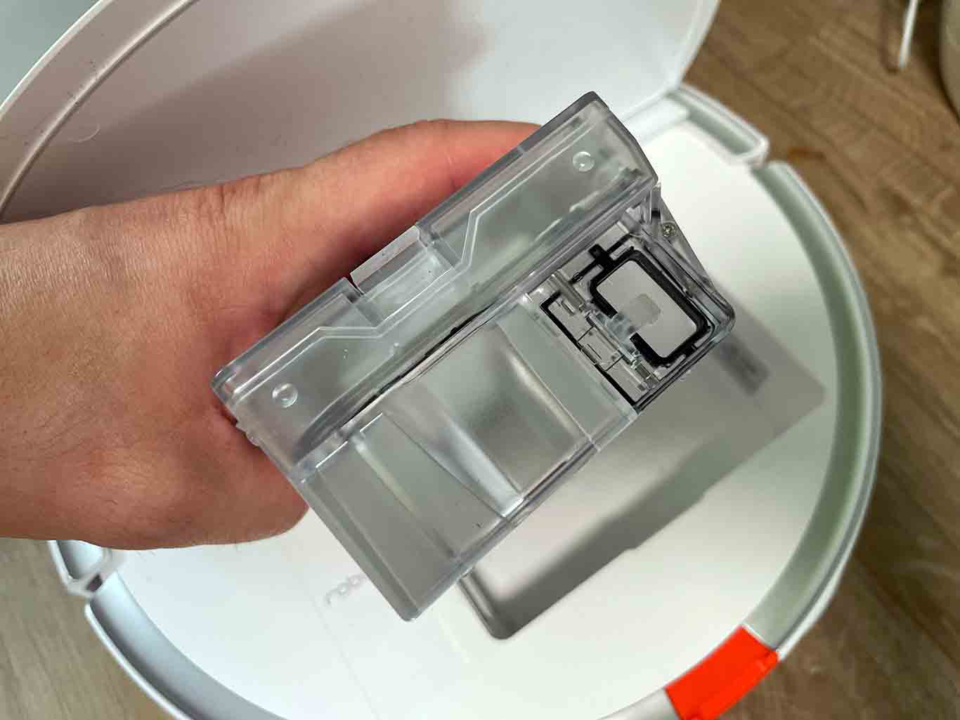 Wenn du für deinen Roborock S7 eine Absaugstation dazu kaufst, dann musst du ein paar Dinge beachten. Zuerst einmal bekommst du einen neuen Staubbehälter mit zugeliefert. Diesen benutzt du zukünftig, da er seitlich einen kleinen Lufteinlass besitzt. Dort wird die Luft von außen hereingezogen, damit die Zugluft den Schmutz durch die Absaugöffnung transportieren kann. Dafür musst du ebenfalls im Inneren des Roborock-Staubbehälterschachtes die weiße Klappe entfernen, hinter dem der Lufteinlass sitzt. Erst jetzt kann aus dem einfachen Roborock S7, den du mit deiner neuen Absaugstation zum Roborock S7+ gemacht hast, der Schmutz in die Absaugstation abgesaugt werden.