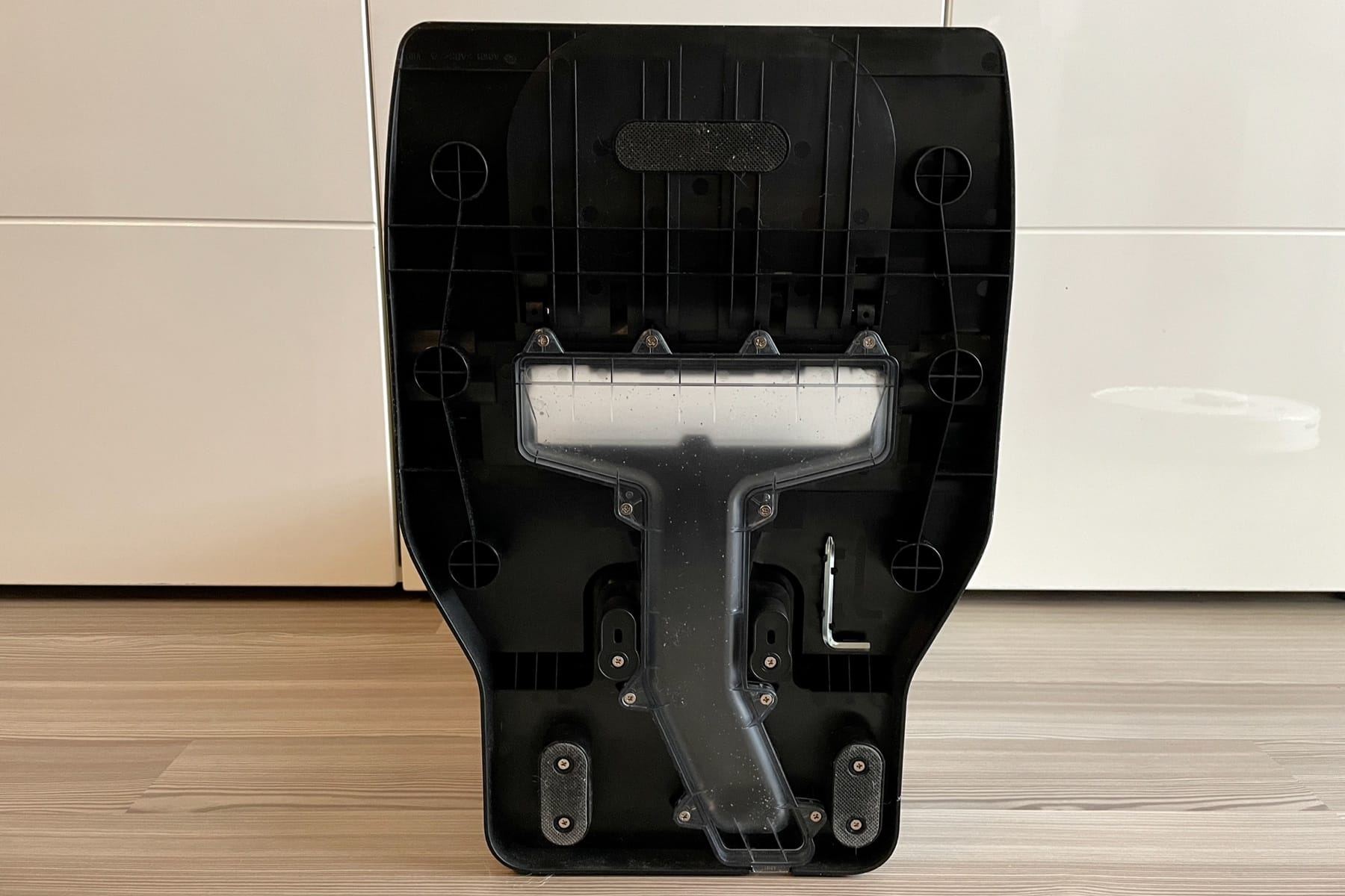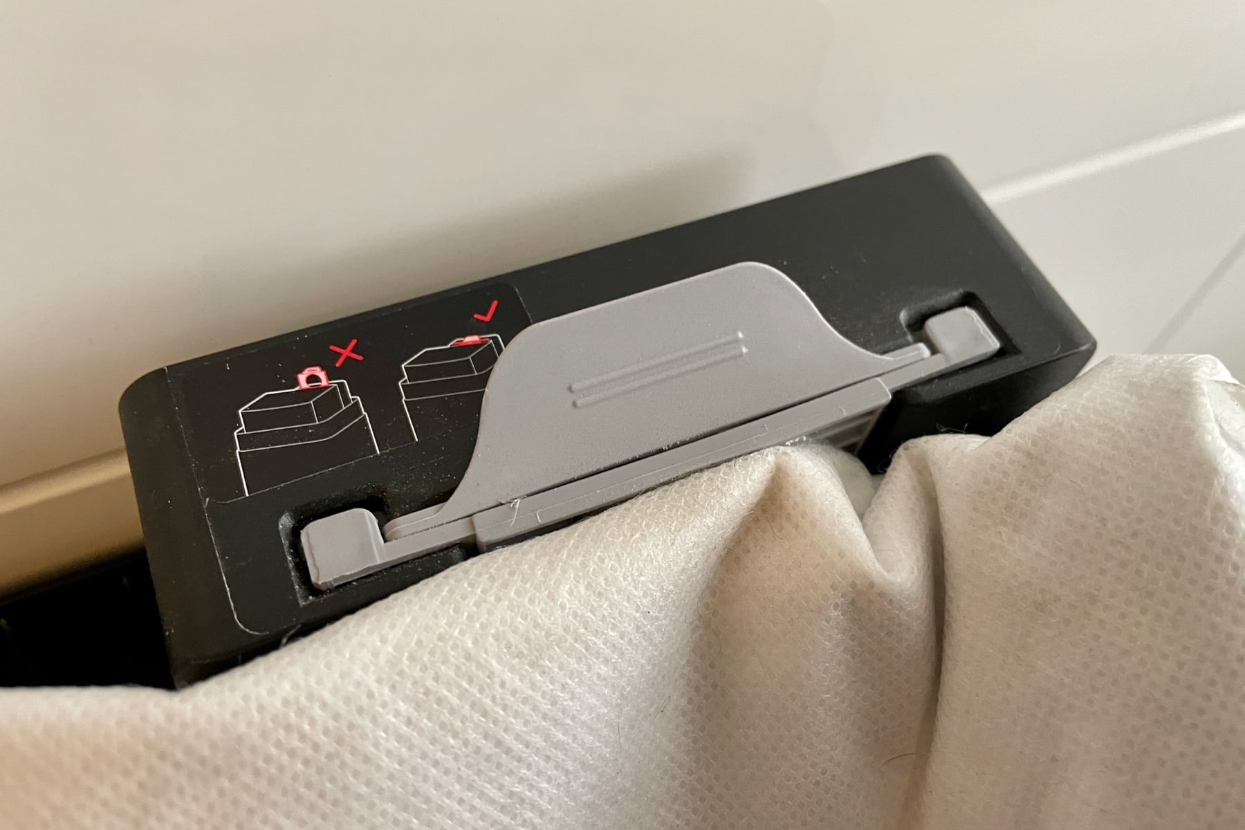 Die Bürstenabdeckung besitzt auf der einen Seite vier kleine Nasen, die unbedingt beim Verschließen der Bürstenaufhängung in die dafür vorgesehenen Schlitze verschwinden müssen. Ist dies nicht der Fall, kann es passieren, dass sich entweder die Bürste beim Absaugvorgang nicht dreht und den Schmutz blockiert oder die Absaugstation von außerhalb Luft einziehen kann und der volle Unterdruck nicht mehr über den Staubbehälter agiert. Ebenfalls kann die Saugleistung beim Reinigen dadurch stark in Mitleidenschaft gezogen werden.