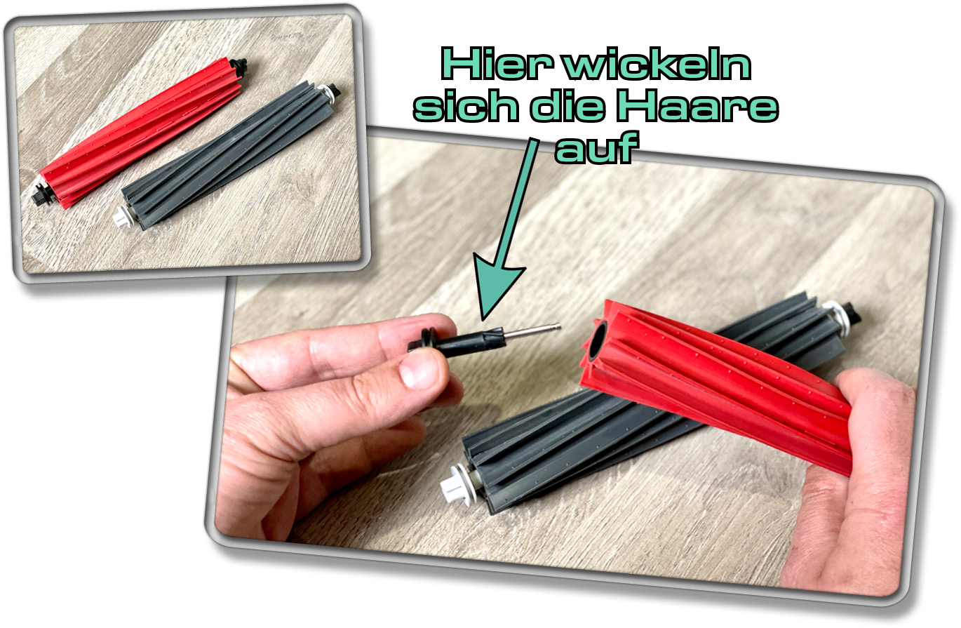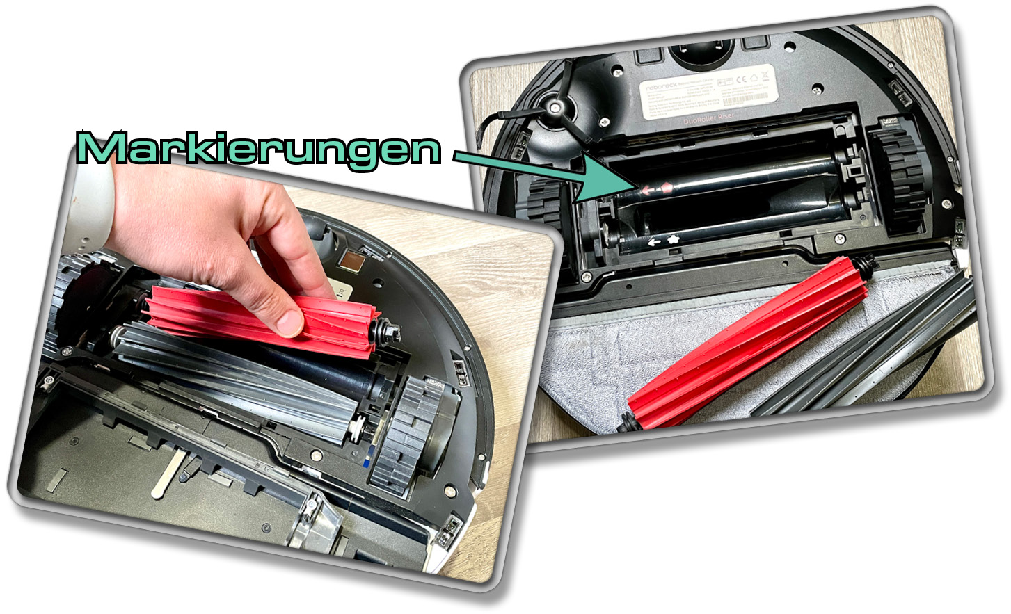 Wenn man einen der Roboter auf den Kopf stellt, dann erkennt man schnell das große Doppelwalzensystem. Die Bürsten sind in einer schwimmend gelagerten Bürstenaufhängung eingesetzt und können ohne große Mühe entfernt werden. Dafür öffnet man die Abdeckung und entfernt Bürste für Bürste. Unter den Bürsten sind spezielle Markierungen angebracht, die zeigen, welche Bürste in welchen Antrieb gehört. So lassen sie sich fehlerfrei wieder einsetzen.