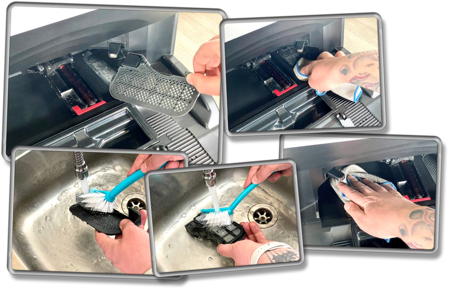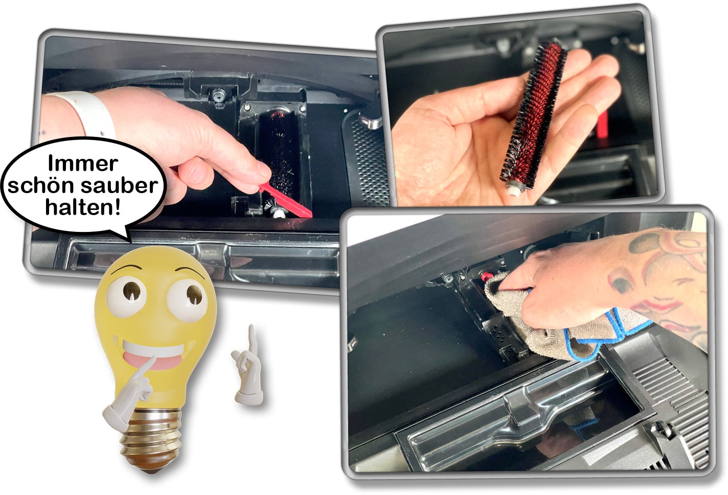 Des Weiteren ist das regelmäßige Reinigen der Waschstation wichtig. Die rotierende, aus Kunststoff bestehende Bürste, die das Wischpad sauber bürstet, sollte in regelmäßigen Abständen herausgenommen und gereinigt werden. Nach gewisser Zeit ist auch dafür ein Ersatz notwendig. Das Abfanggitter, das verhindert, dass Schmutz in die Pumpleitungen gerät, sollte auch mindestens einmal die Woche herausgeholt und gereinigt werden. Eine einfache Küchenbürste ist dafür das passende Werkzeug.