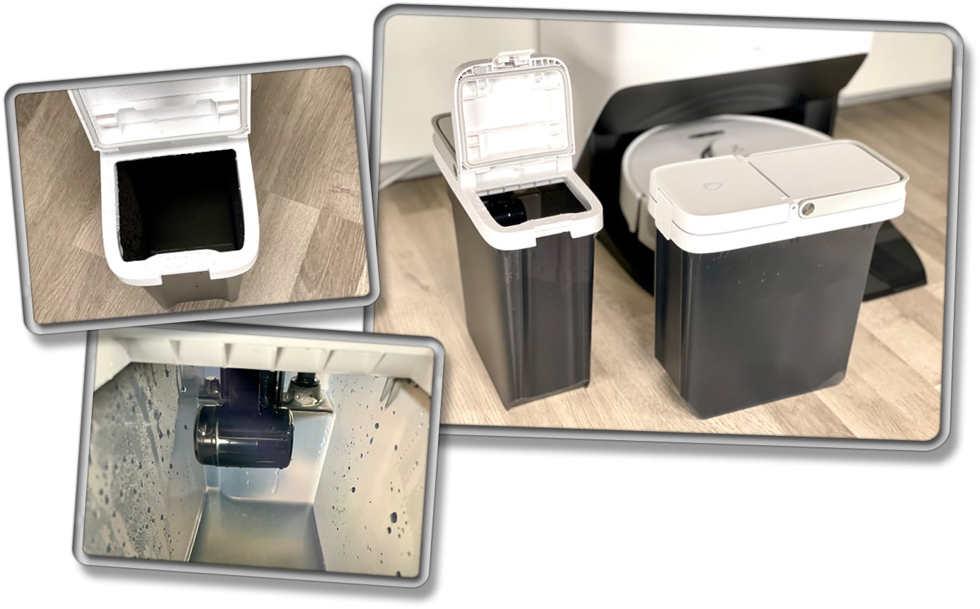 Natürlich darf bei solch einer Multifunktionsreinigungsstation wie dem RockDock Ultra eine Absaugfunktion nicht fehlen. So hat auch diese Station die Funktion mit an Bord. Nachdem das Wischpad ausgewaschen ist, dreht sich der Roboter wieder mit seiner Front voraus in Richtung Station und fährt sanft hinein. Sobald das Andocken erfolgreich war, startet die in der Absaugfunktion der Station und saugt den im Saugroboter befindlichen Staubbehälter leer. Das sorgt dafür, dass dieser für mehrere Wochen nicht mehr von Hand ausgeleert werden muss.