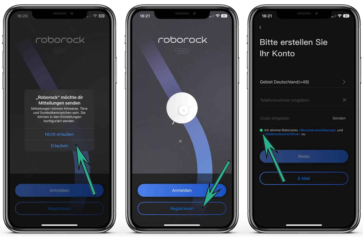 Im nächsten Schritt musst du der Roborock App erlauben, dass sie dir wichtige Mitteilungen zukommen lassen darf. Im Anschluss drückst du auf „Registrieren“, um ein Roborock-Konto anzulegen. Jetzt öffnet sich ein Fenster, in dem du dein Herkunftsland auswählst und deine aktuelle E-Mail-Adresse eingibst. Alternativ kannst du auch auf den Punkt „Telefon-Nummer“ klicken, wenn du keine E-Mail-Adresse besitzt oder sie nicht nutzen möchtest. Wenn das geschehen ist, stimmst du noch den Benutzervereinbarungen und Datenschutzrichtlinien zu, indem du auf den kleinen Punkt und anschließend auf „Senden“ klickst.