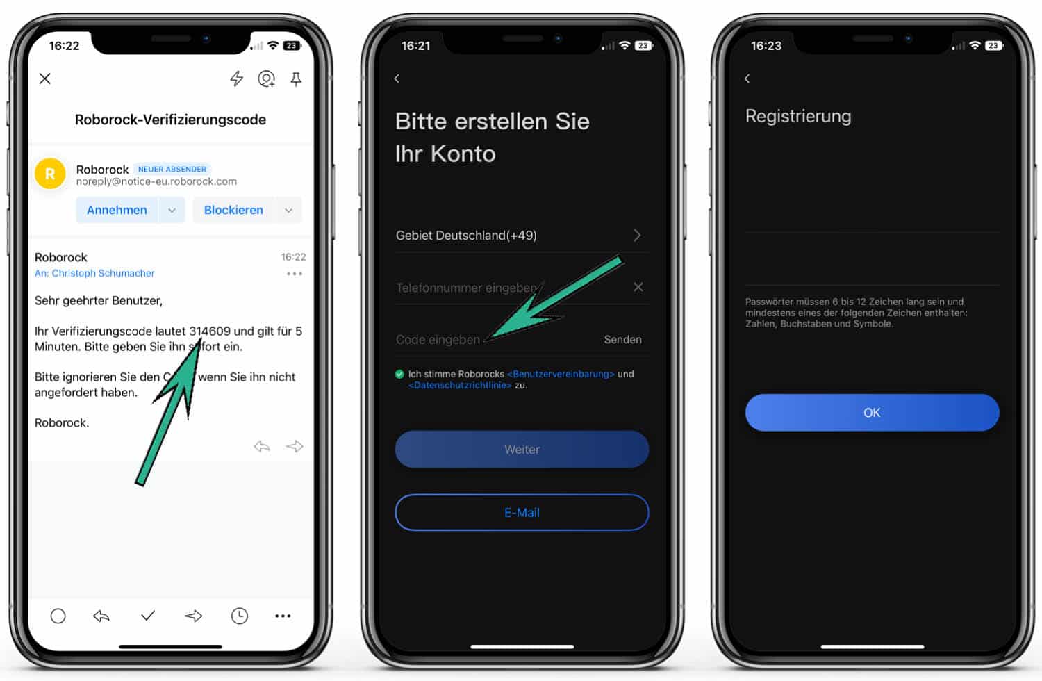 Jetzt heißt es schnell sein! Du hast genau 60 Sekunden Zeit, den dir über E-Mail oder SMS zugeschickten Code in das Eingabefeld einzutragen. Ist das erledigt, kommst du auf eine Seite, auf der du ein eigenes Passwort für die App festlegen sollst. Hier schreibst du dein gewünschtes Passwort in das obere Feld und wiederholst es darunter. Wenn du so weit bist, drückst du noch auf „OK“ und hast damit dein Roborock-Konto erstellt.