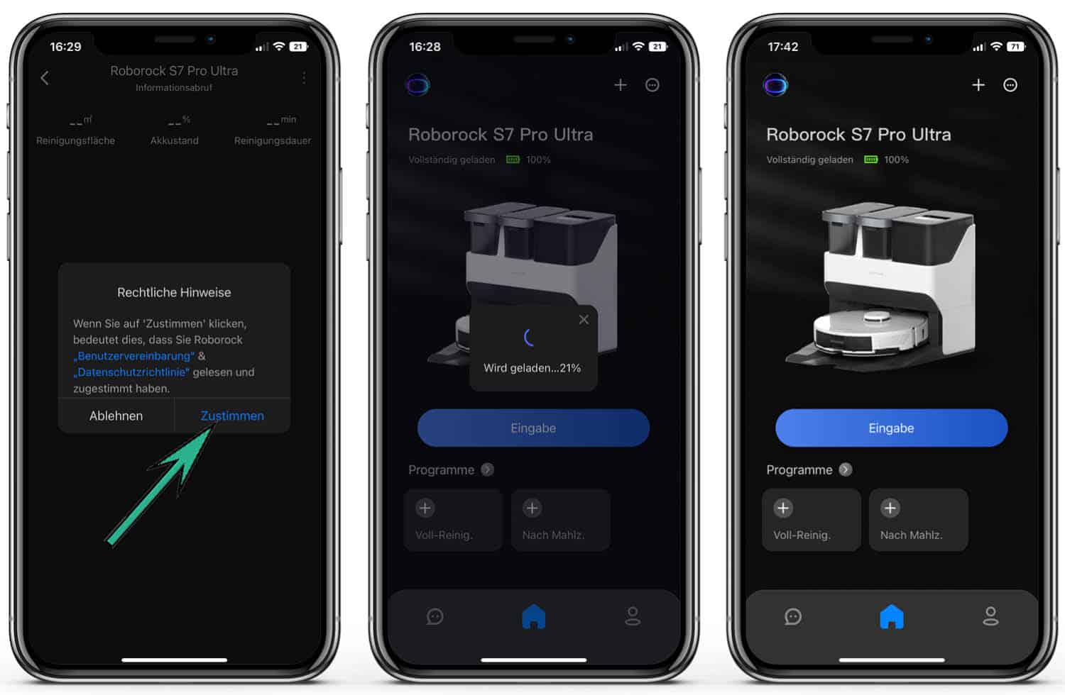 Im letzten Schritt musst du noch den Benutzervereinbarungen und Datenschutzrichtlinien zustimmen und schon wird die Einrichtung deines Roborock S7 Pro Ultra abgeschlossen. Nachdem dein Saugroboter jetzt einsatzbereit ist, kommen noch einige kleine Einrichtungshinweise, die dir die ersten Schritte mit dem Roboter erklären. Abschließend kannst du mit einem Klick auf „Eingabe“ auf den vollen Funktionsumfang des Roborock S7 Pro Ultra zugreifen und mit der ersten Kartierung beginnen!